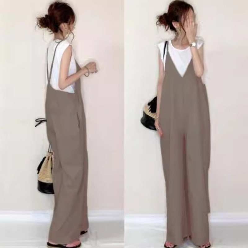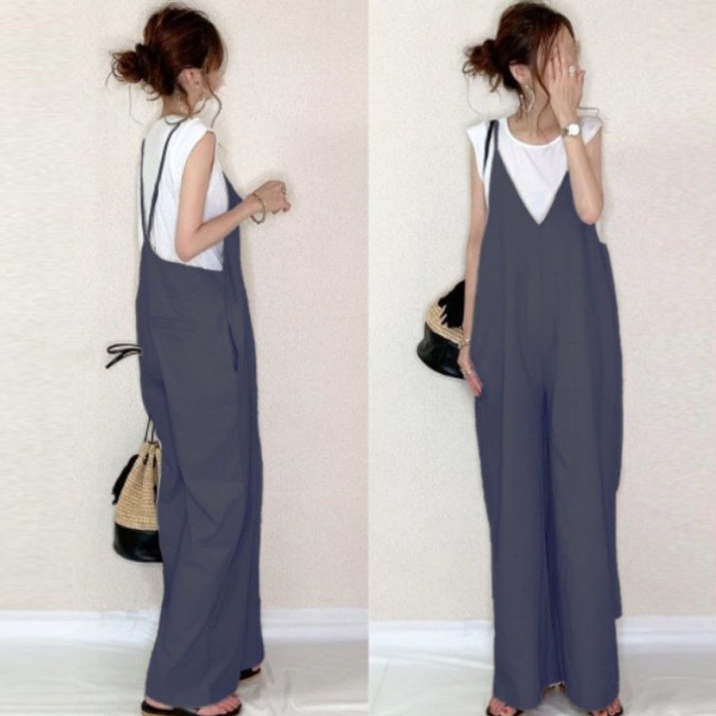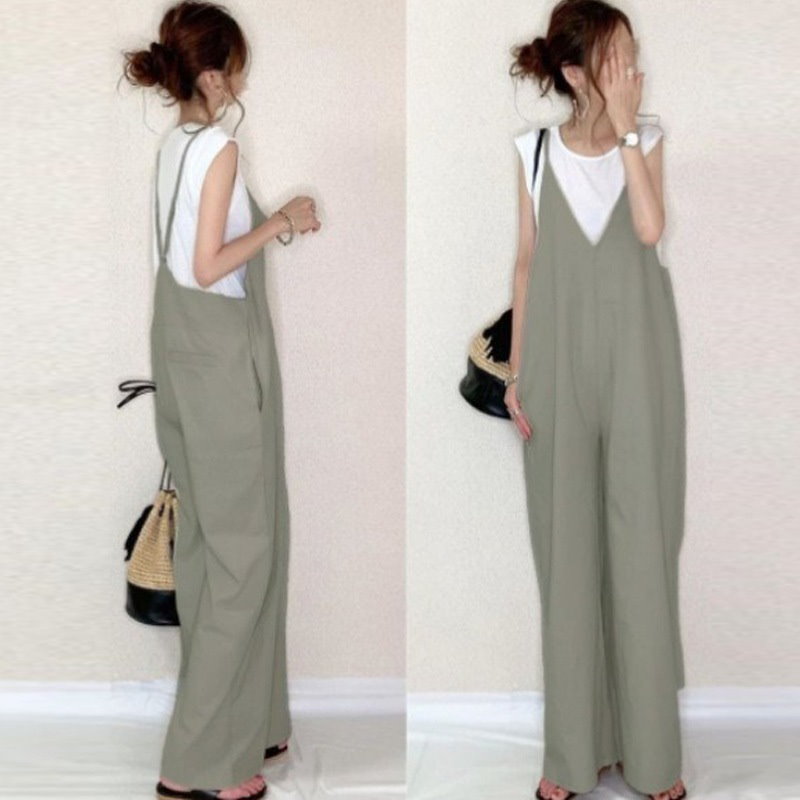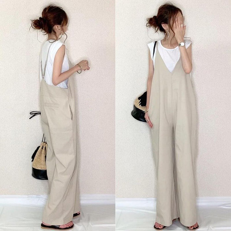 サロペット 春 夏 オールインワン ゆったり レディース Vネック 体型カバー パンツ 着痩せ 無地 ワイドパンツ オーバーオール ボトムス ロングパンツ リゾート シ