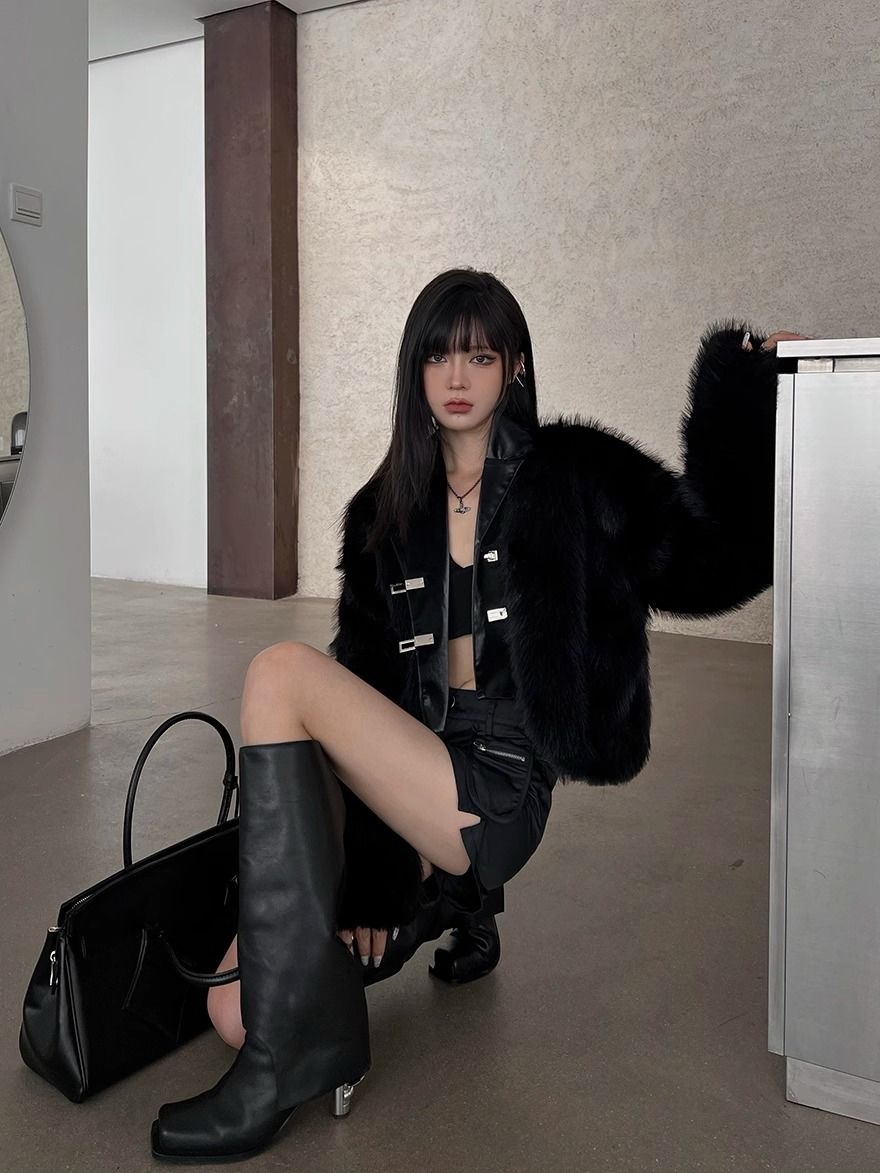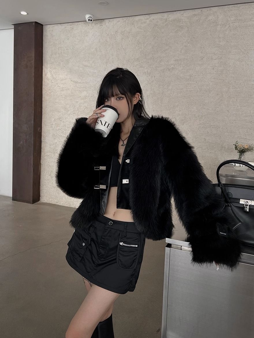 冬アウター 黒ファーコート 韓国ファッション 秋冬モコモコ保温厚手トップス ジャケット ジャケット ファー 毛皮アウター