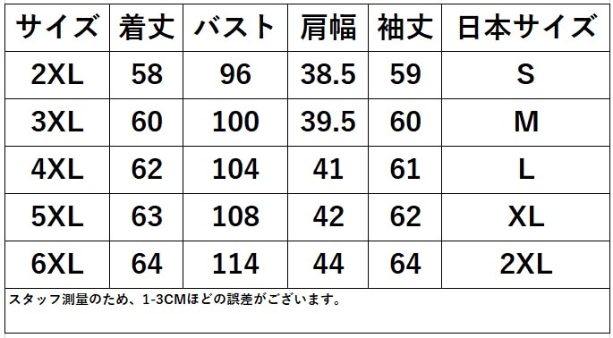 サイズ: 2XL(日本サイズS) 3XL(日本サイズM) 4XL(日本サイズL) 5XL(日本サイズXL) 6XL(日本サイズ2XL)