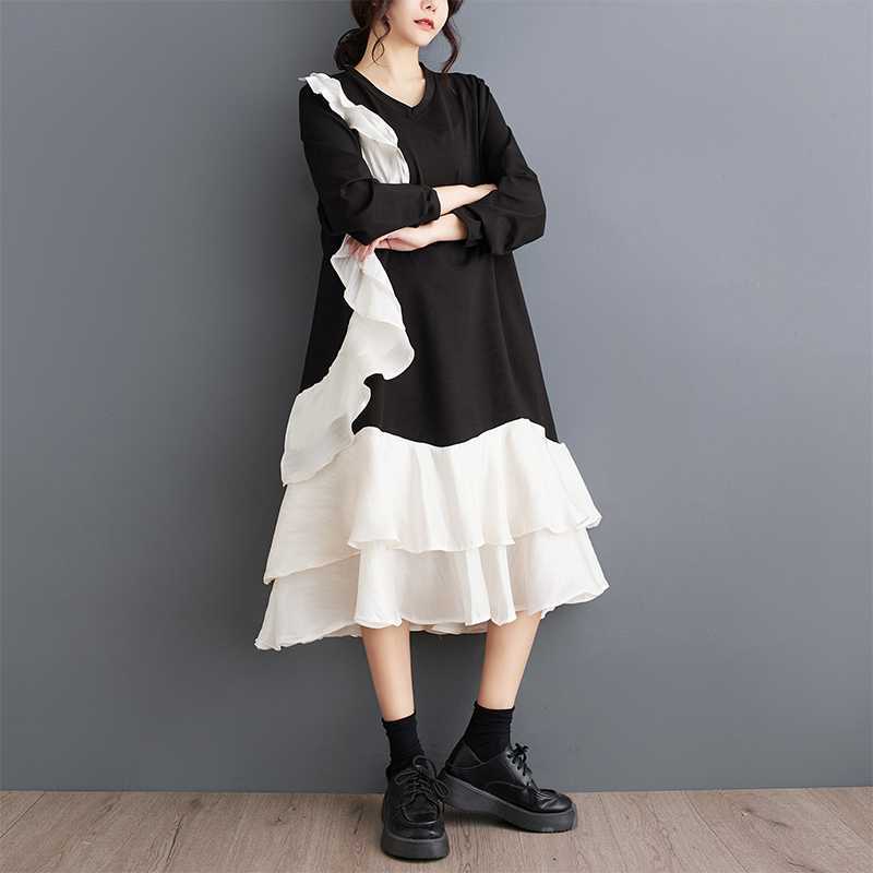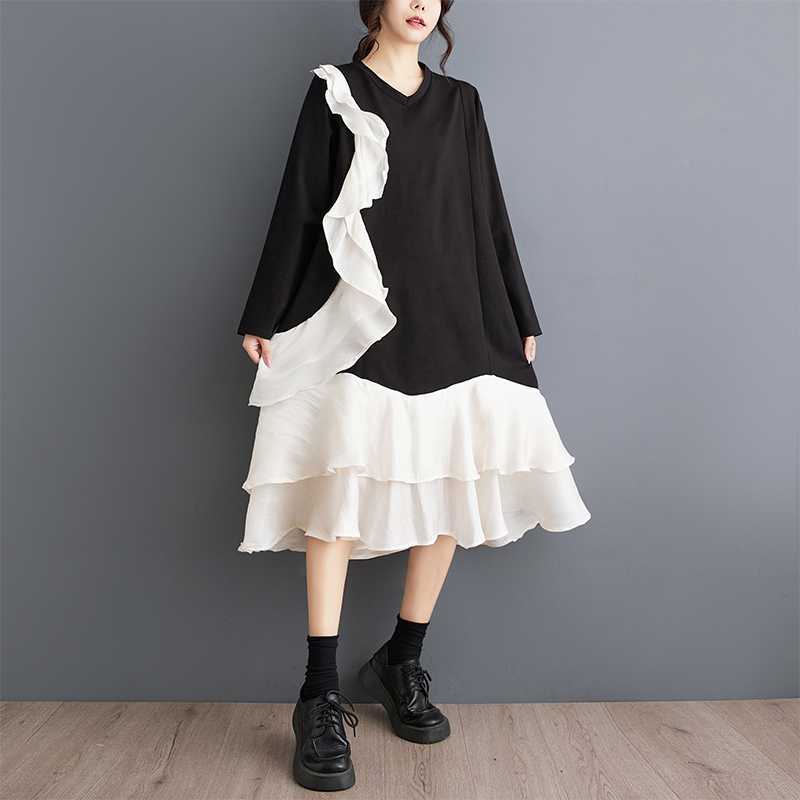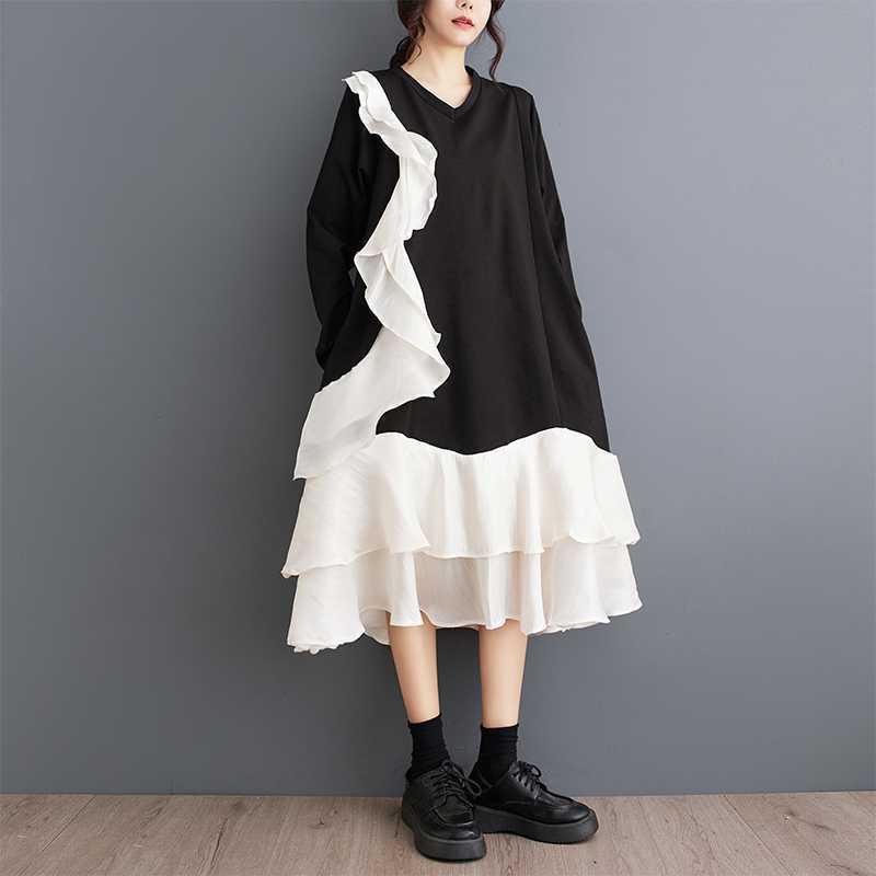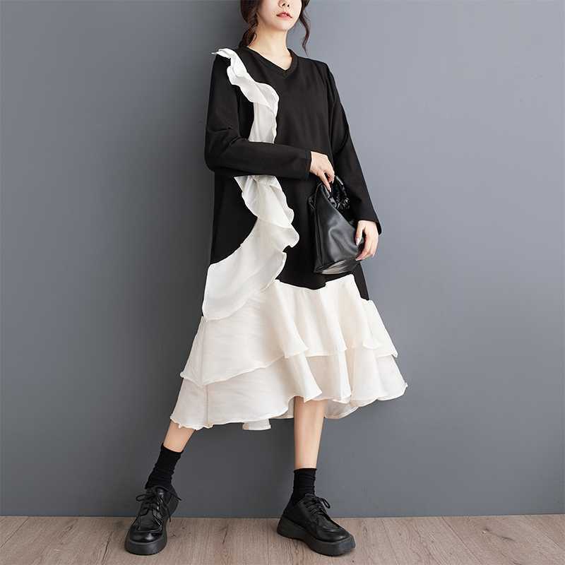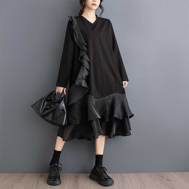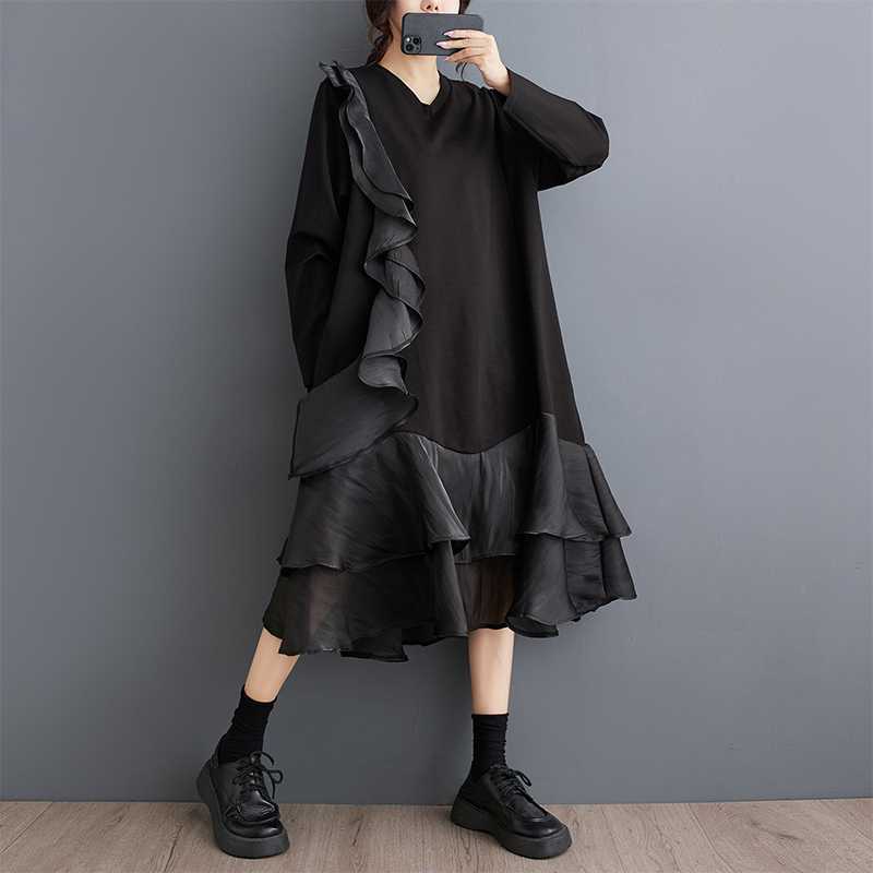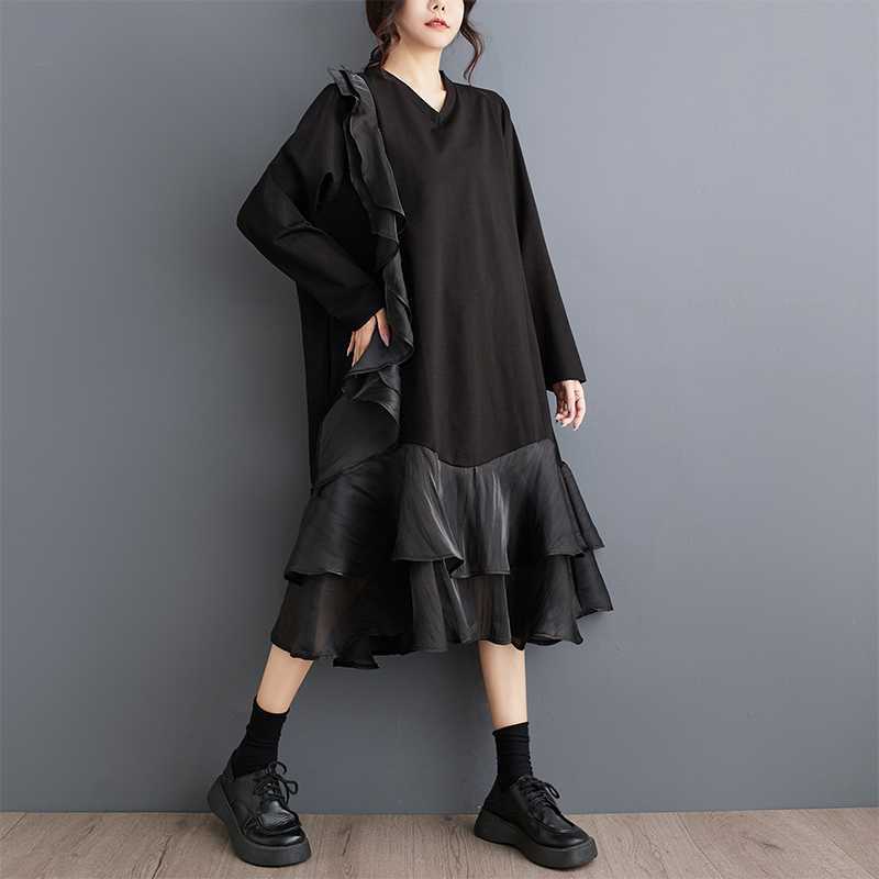 2024秋新品 フリフワンピース 大きいサイズ 体型カバー レディース vネック ドッキング ロングワンピース メガ割 シャツワンピ