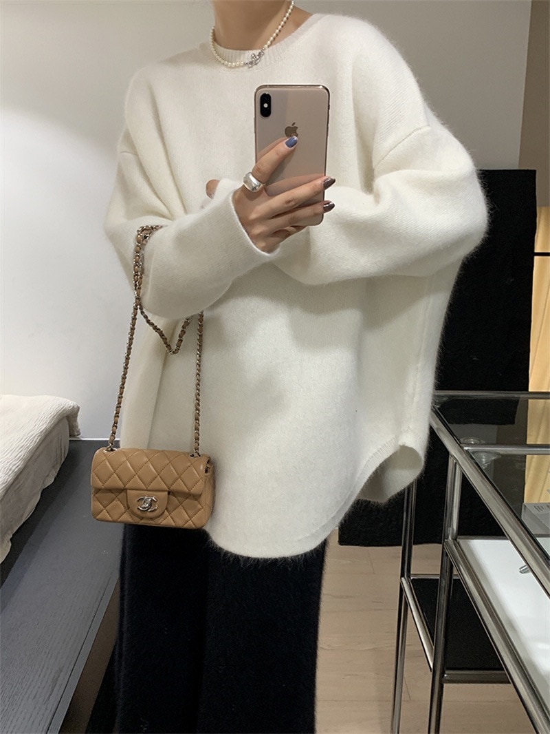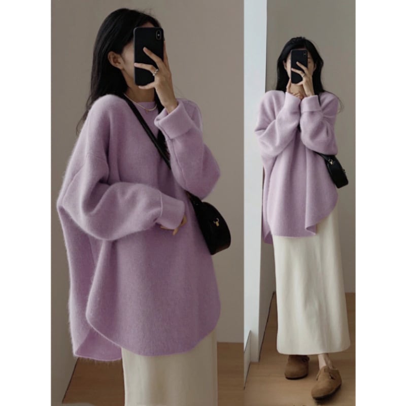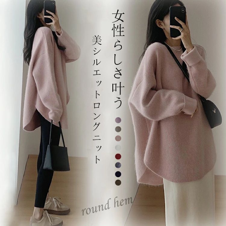 新品入荷 ニット セーター レディース 微起毛 秋冬 長袖 暖かい ラウンドヘム ラウンドネック モヘア シャギー オーバーサイズ ゆったり トップス チュニック丈 ドロップショルダー こなれ感