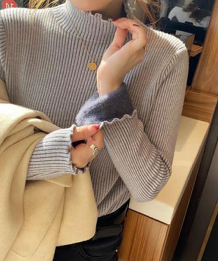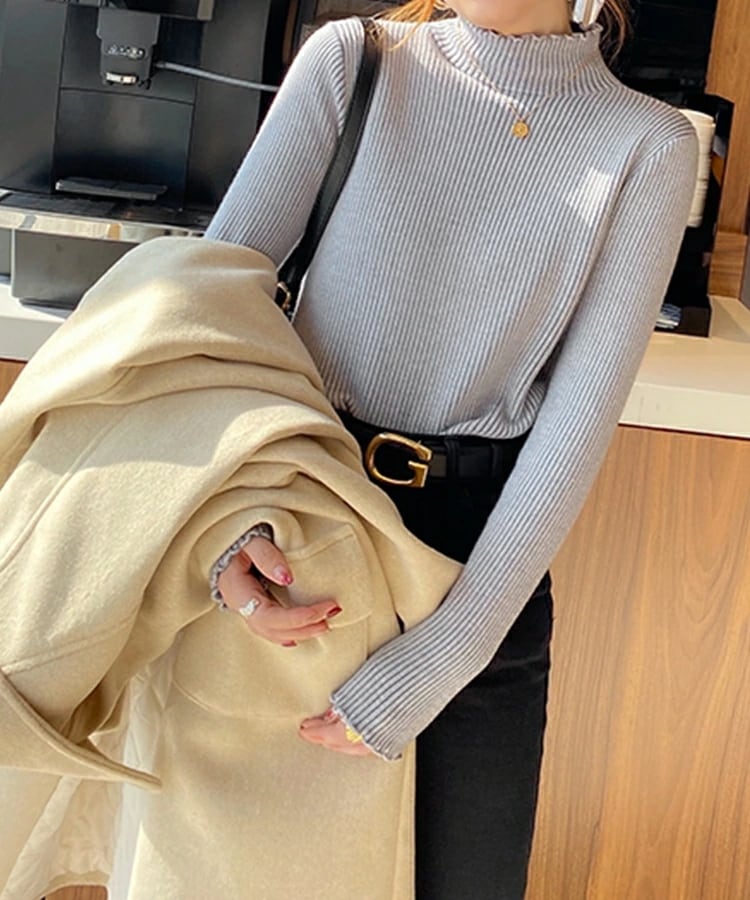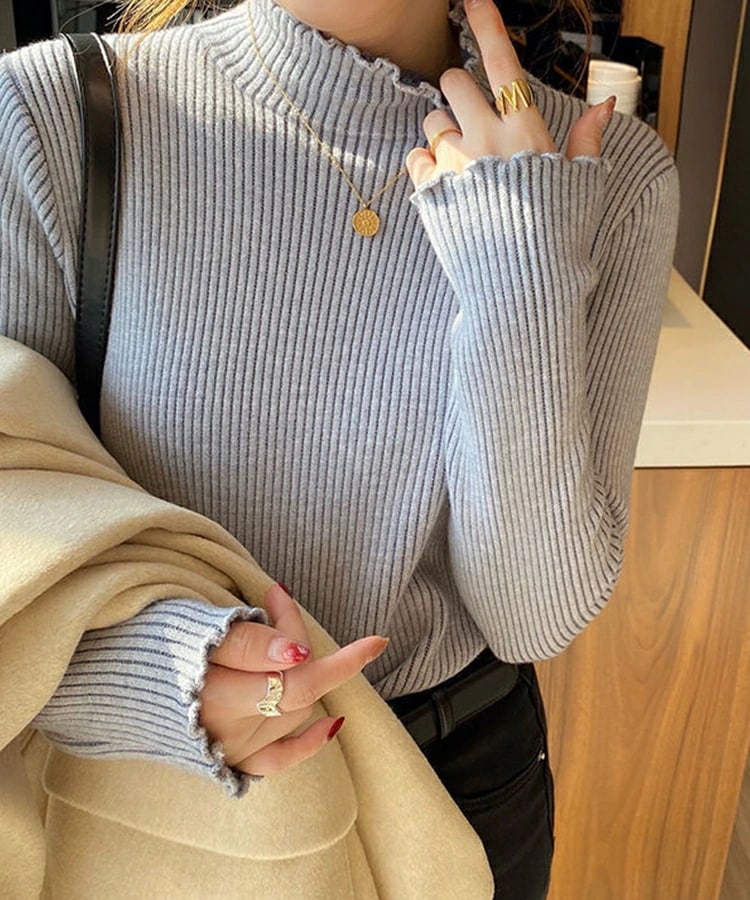 裏起毛 ハイネック ニット セーター トップス 裏ファー レディース リブ フリルネック フリル 長袖 タートルネック 無地 暖かい 厚手 オフィスカジュアル きれいめ 春秋冬 重ね着