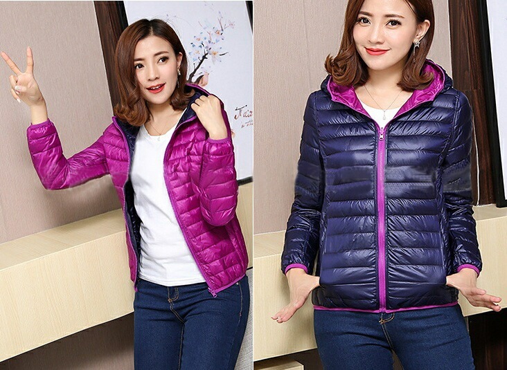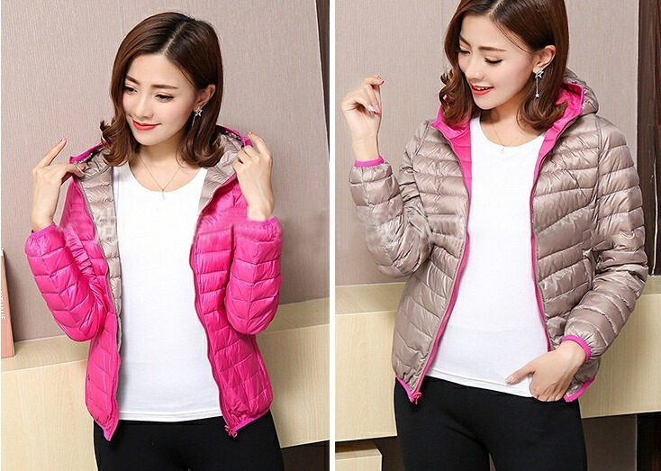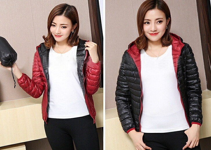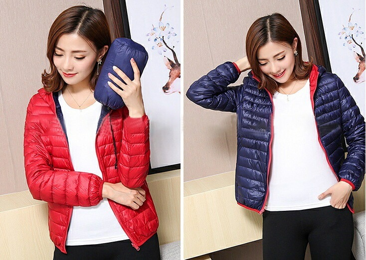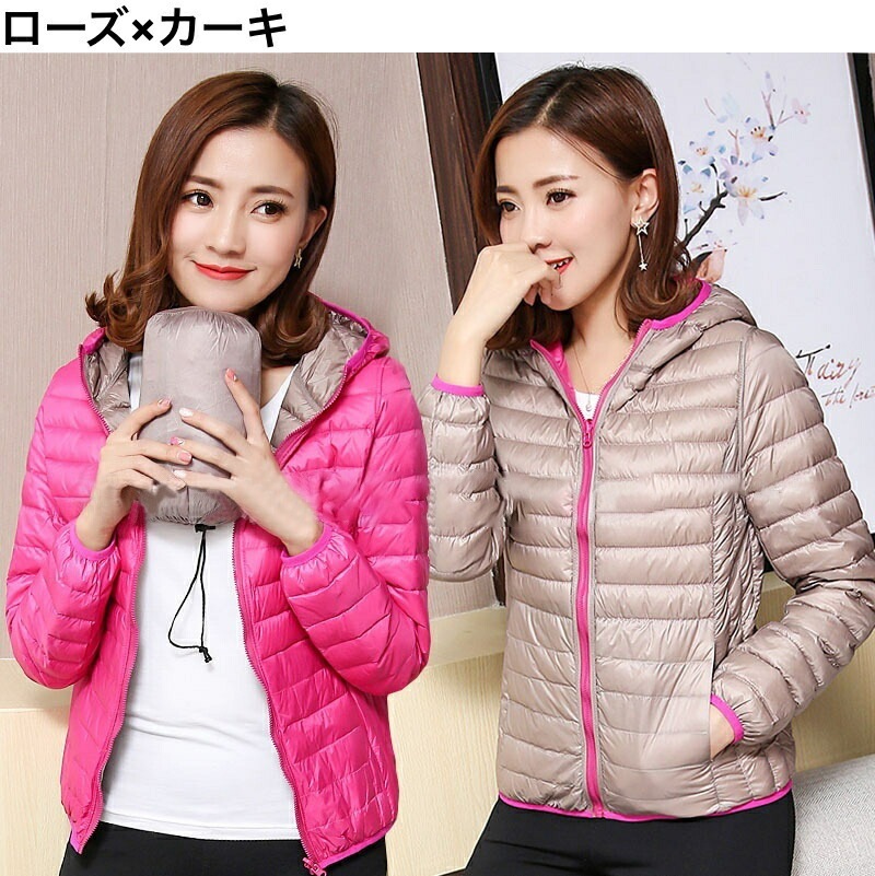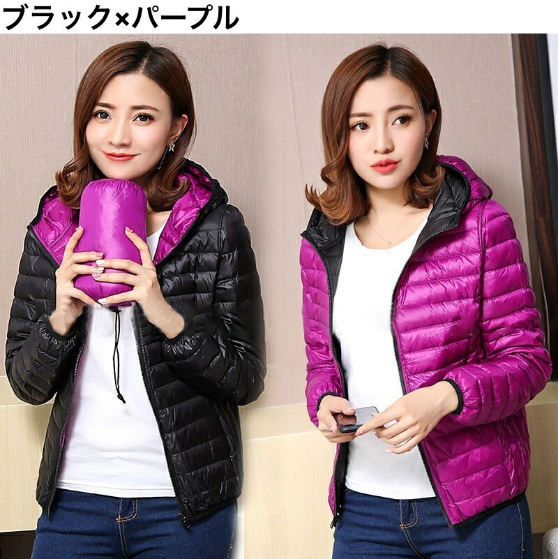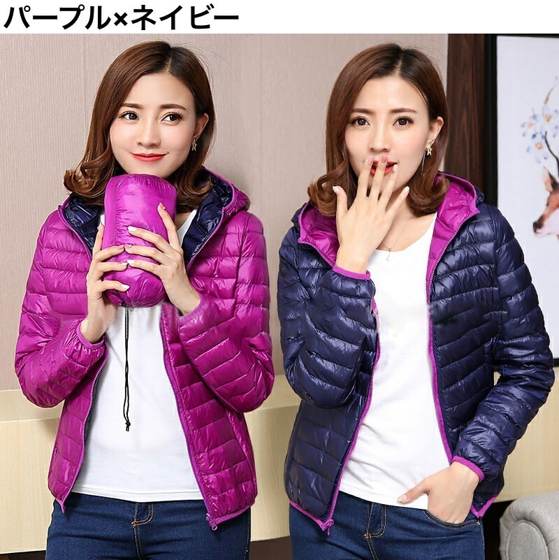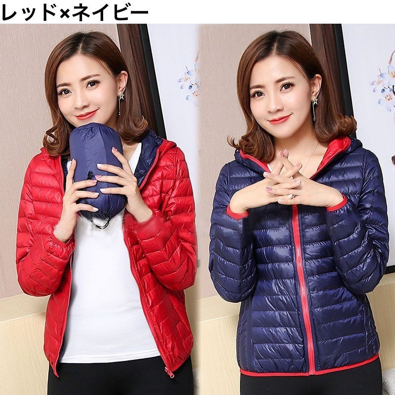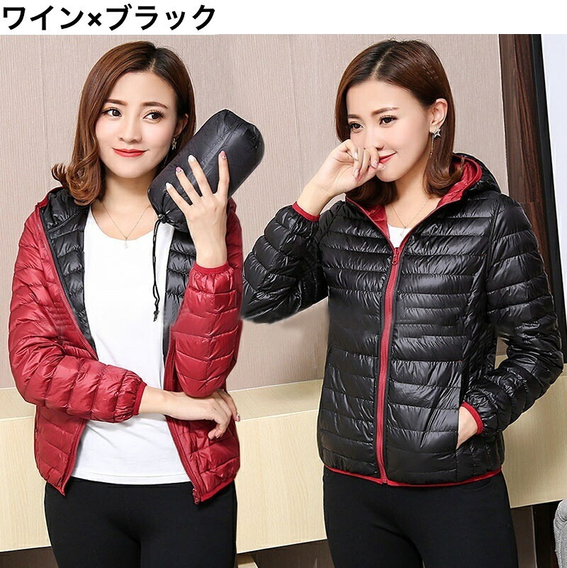 中綿ジャケット 中綿入りジャンパー ダウン風 リバーシブル 収納袋付き レディース 女性 アウター 上着 ライトジャケット 薄手 長袖 フード付き ジップアップ 大きいサイズあり 秋 冬 無地 カジュ