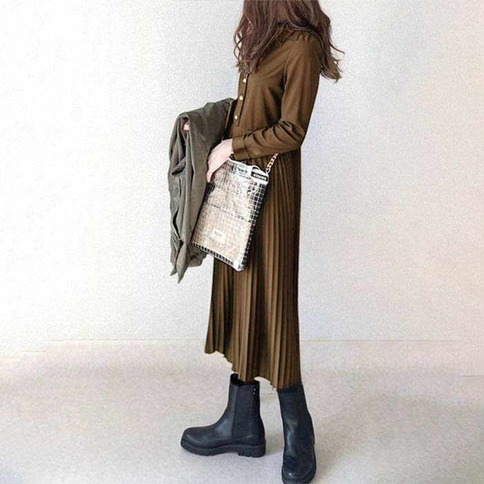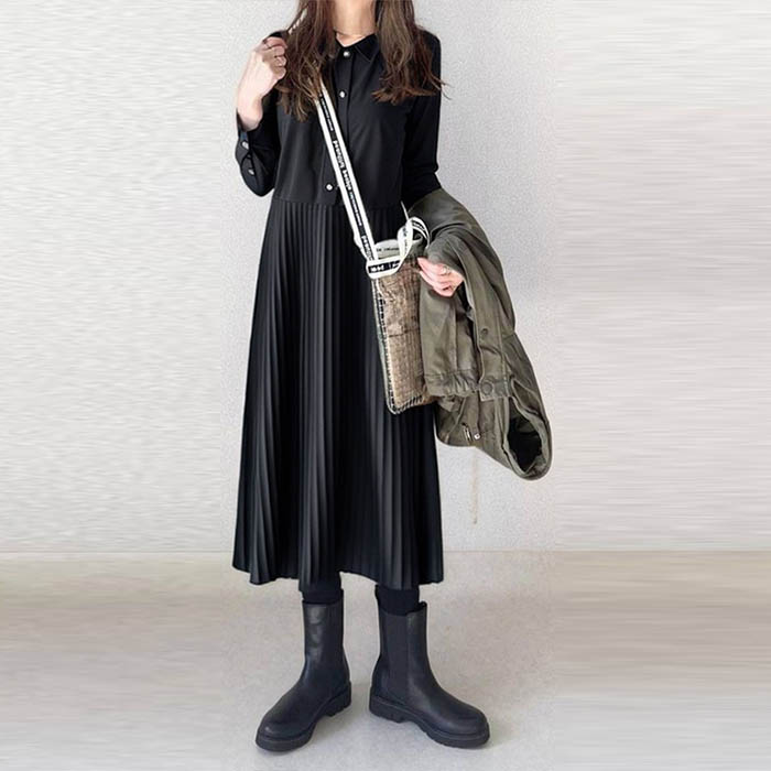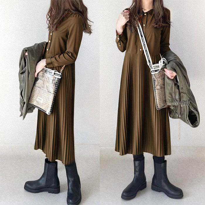 ワンピース 長袖 春 秋 レディース プリーツ ワンピース ロング シャツワンピース 切り替えワンピース Aライン 着痩せ ミモレ丈 きれいめ ゆったり Aライン プリーツワンピース キレイめ