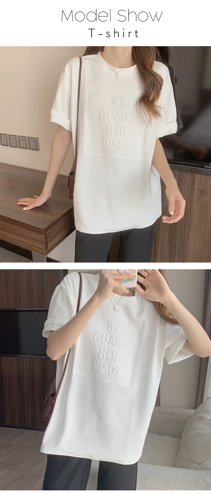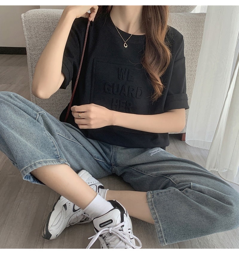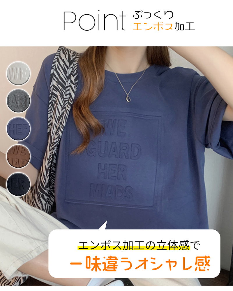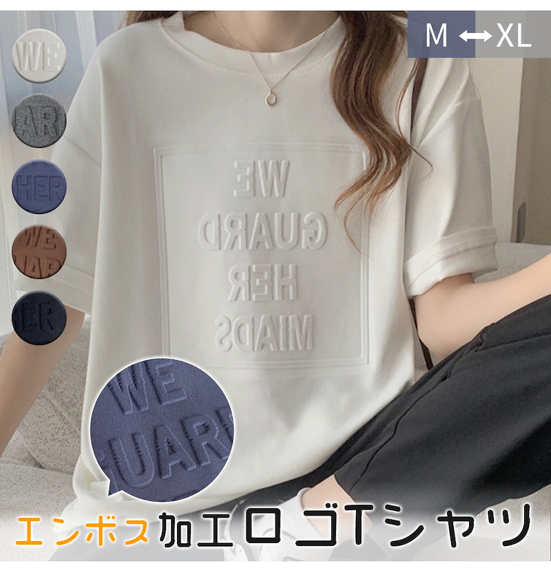 立体的なロゴが可愛い エンボス加工ロゴTシャツドロップショルダー レディース Tシャツ 半袖 袖あり 涼し気な着心地 しっかりした生地 ゆっ