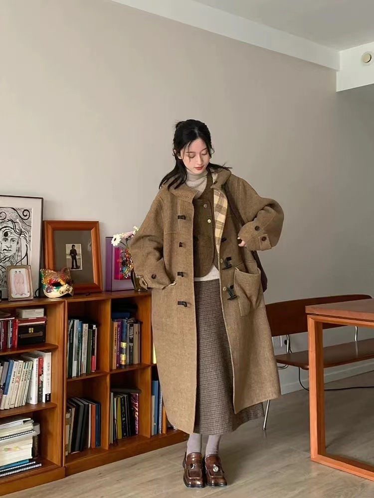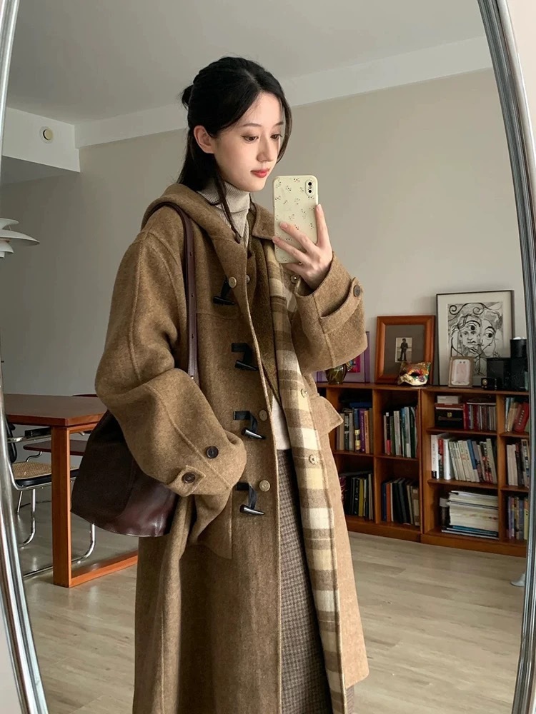 両面着用両面ウールコートの女性の長い段落格子縞フード付き気質韓国ウールツイードのプレミアム感覚 女性用コート ファー 毛皮アウター