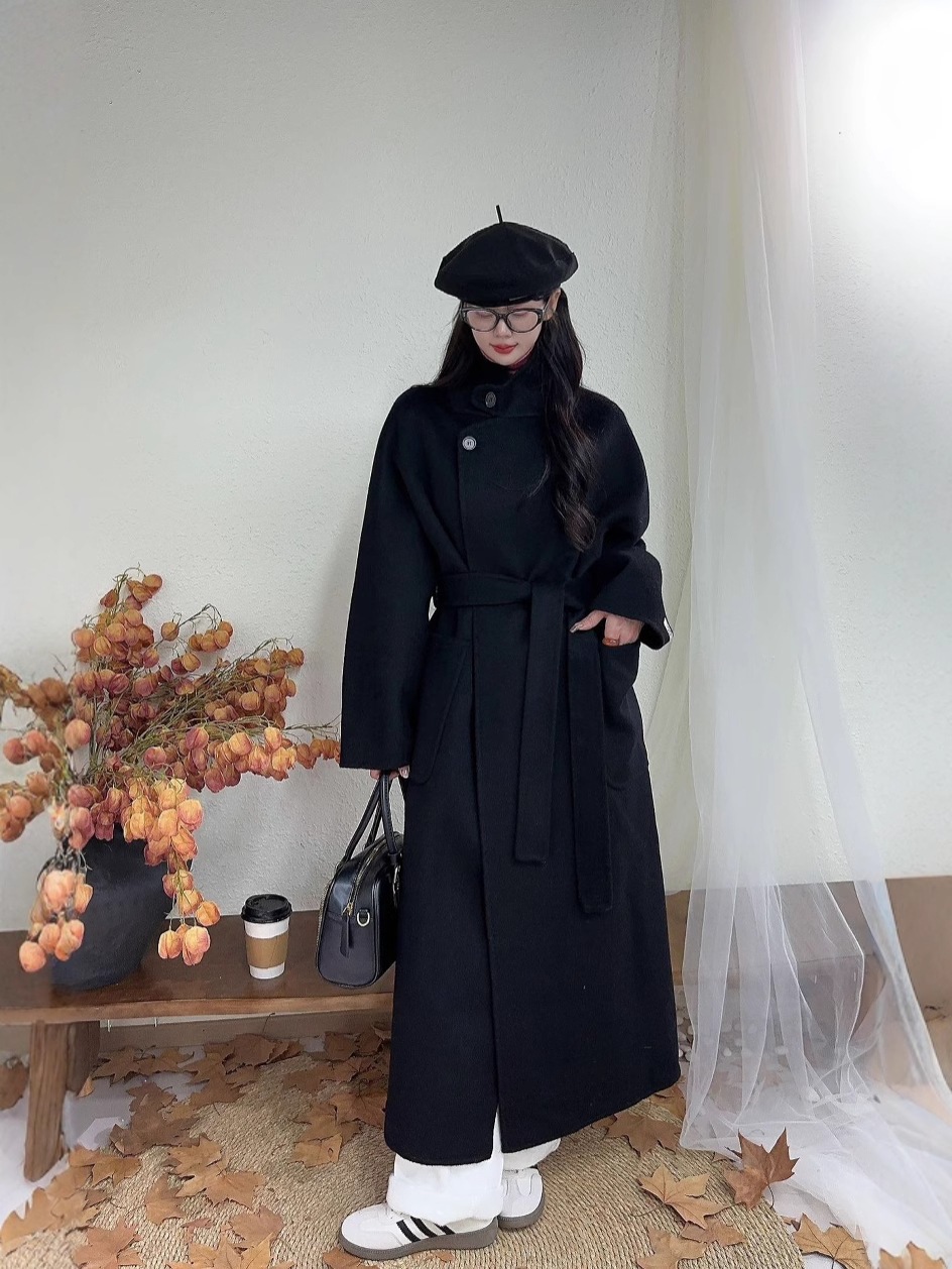 襟タイウエスト両面カシミアコート女性秋冬モデル膝ルーズツイードジャケットのロングセクションの韓国語バージョン ファー 毛皮アウター