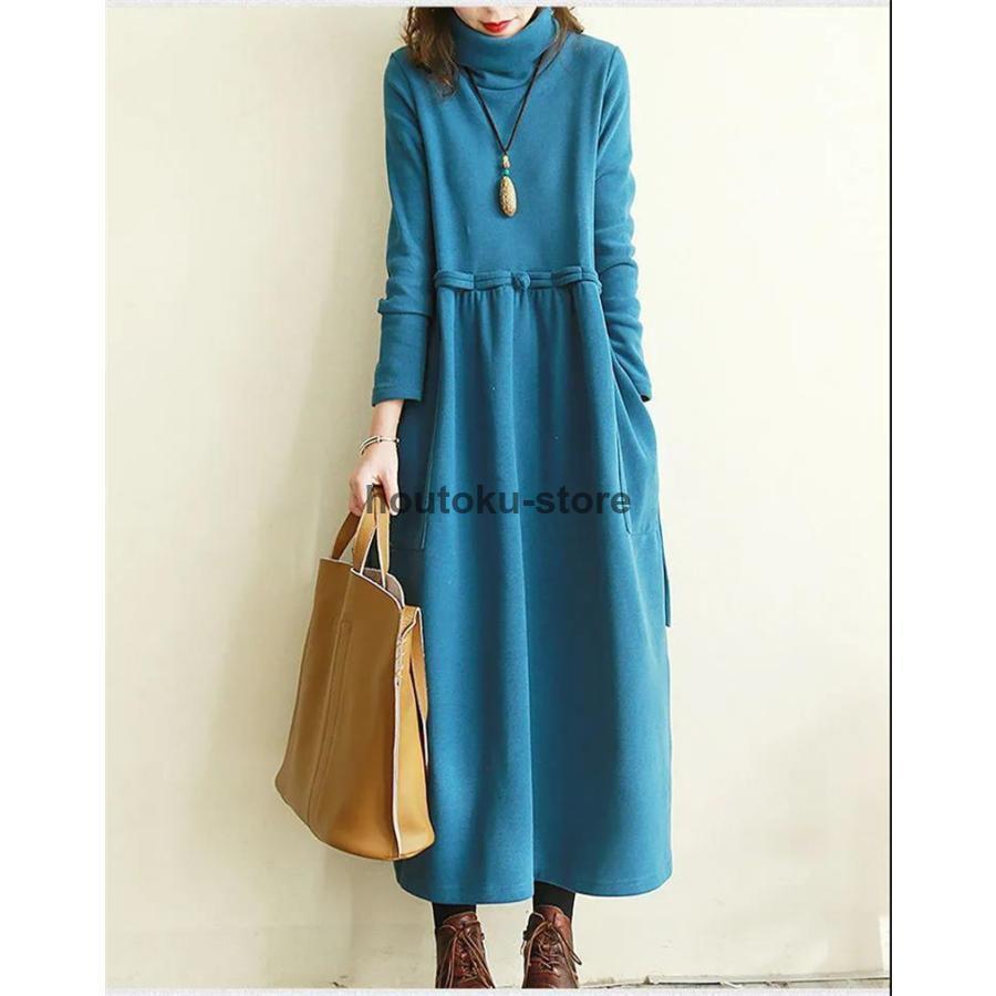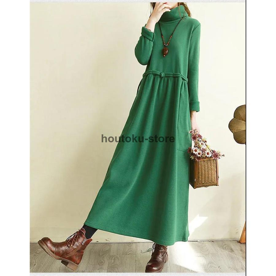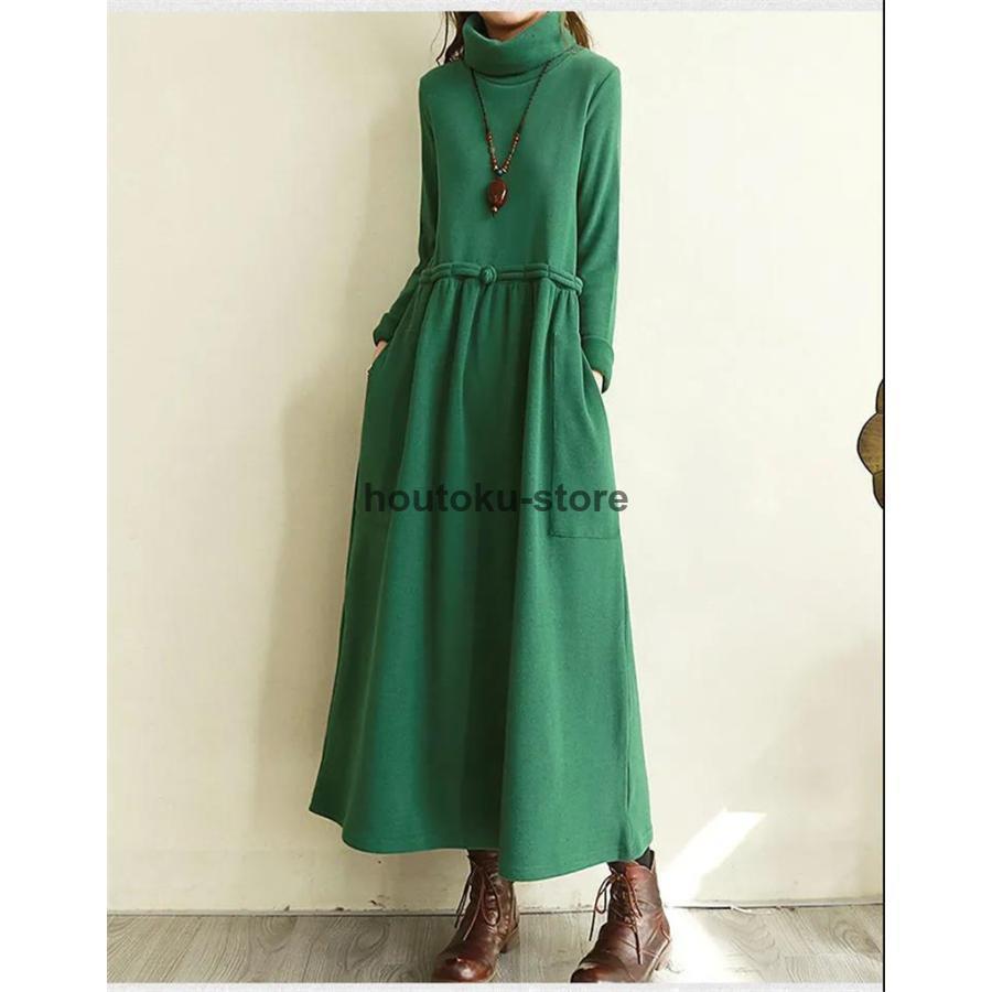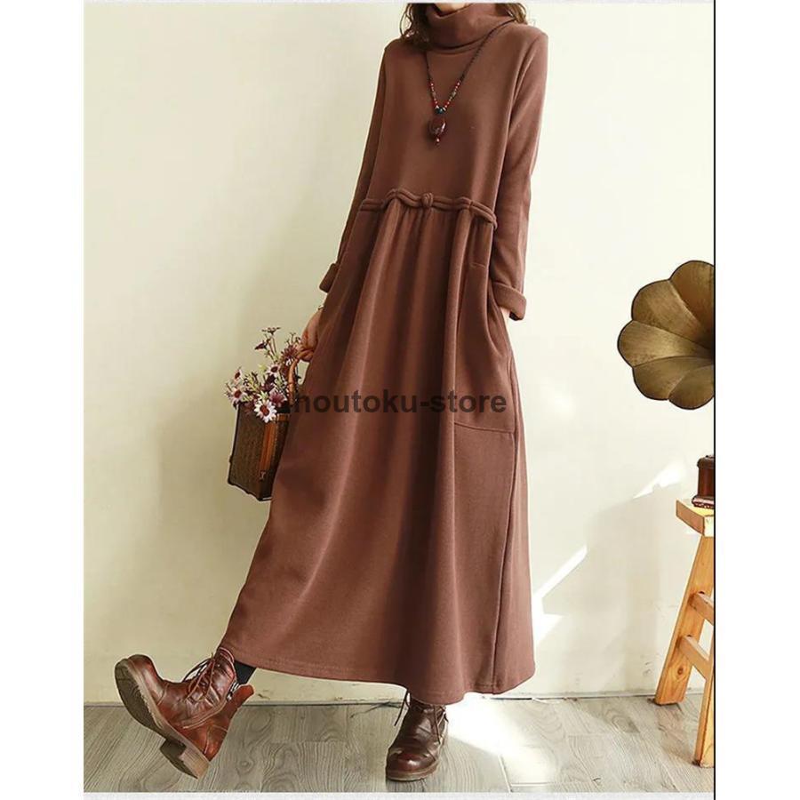 ワンピース マキシワンピース レディース ロングワンピ 秋冬 ハイネック チュニック タートルネック マキシ 無地 微起毛 裏起毛 冬 ポケット付き リラックス