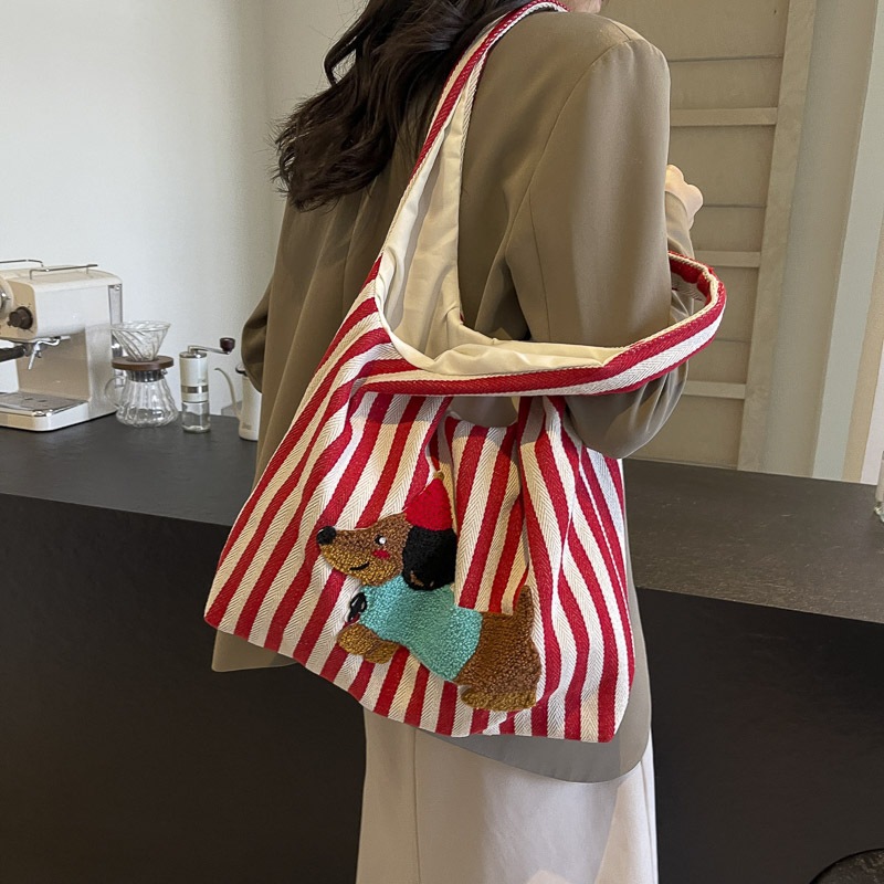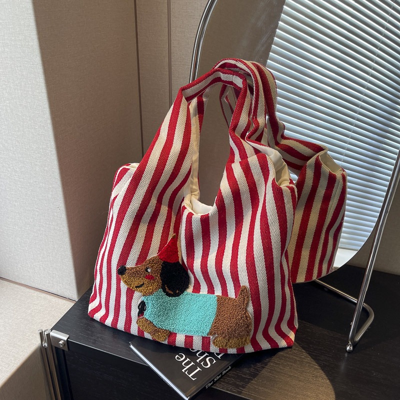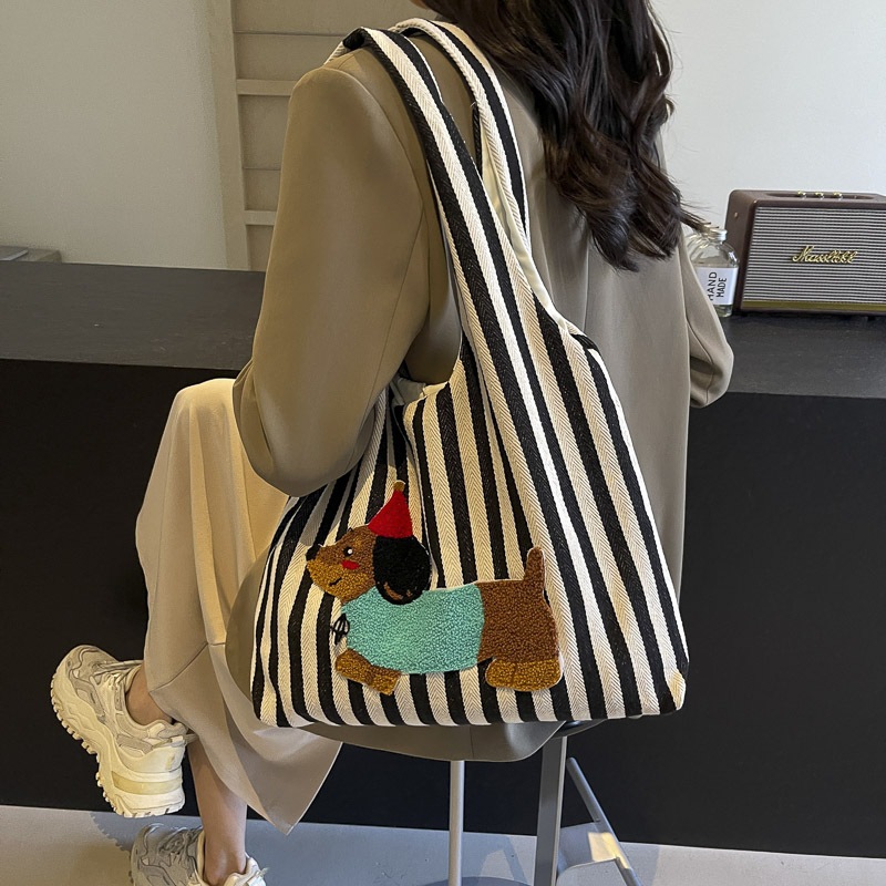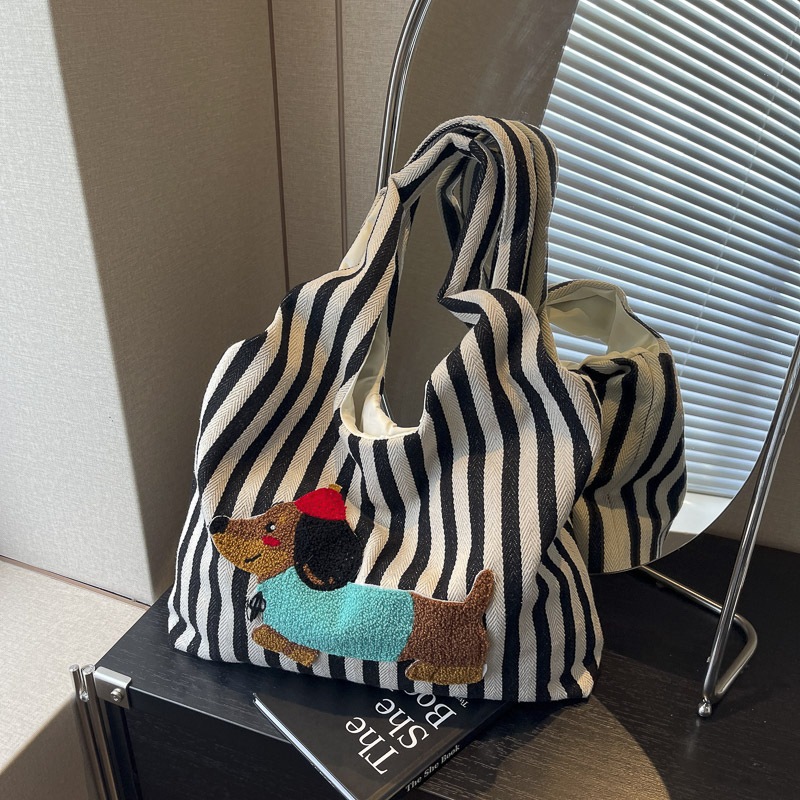 かわいい漫画刺繍子犬ショルダーバッグファッションストライプキャンバス手持ち脇バッグ大容量通勤トートバッグ ハンドバッグ