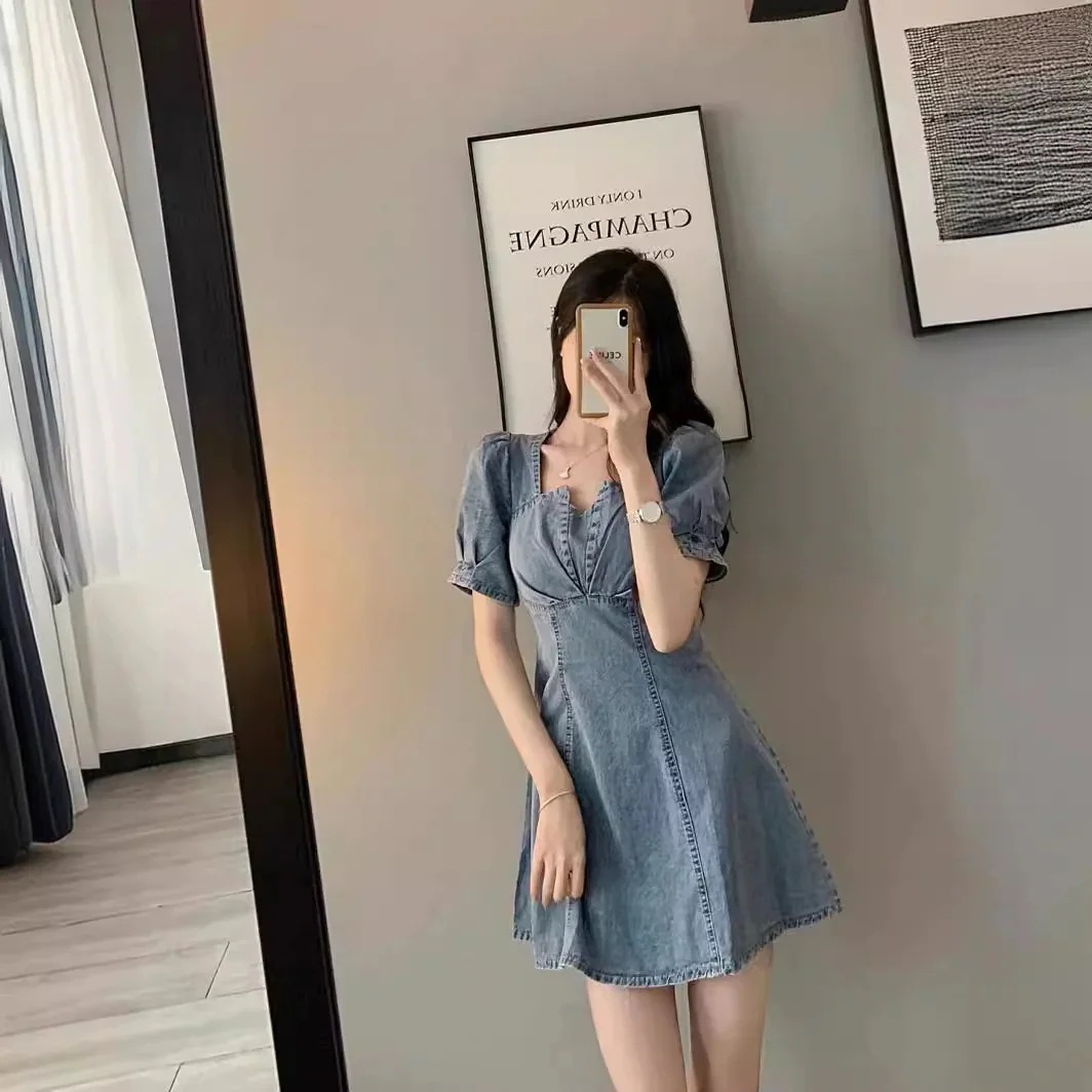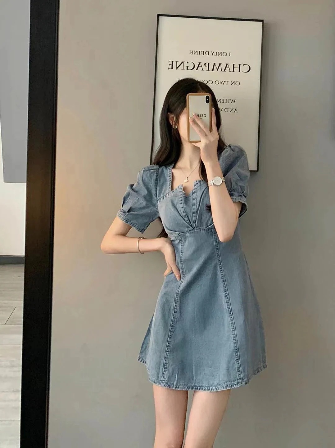 怠惰風 ニューデザイン デニム ワンピース スカート ウエスト引き締め バブル袖 ファッション 着痩せ 可愛い デニムワンピ