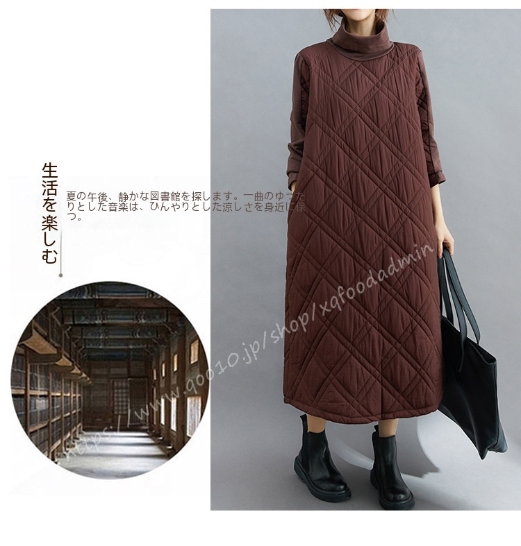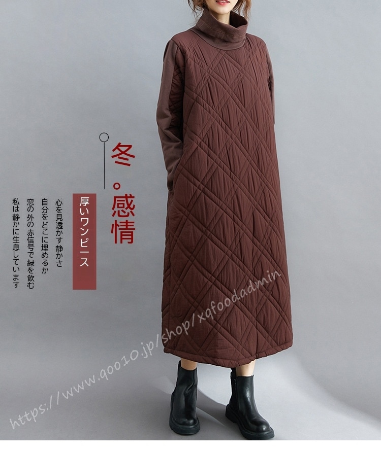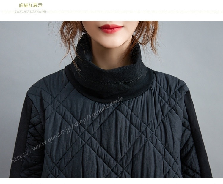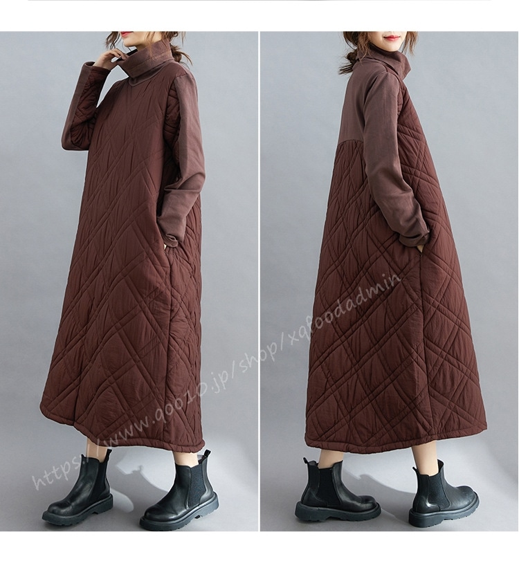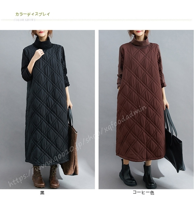 キルティング カジュアル ワンピース 黒 40代 秋 マキシワンピース 切り替え 長袖 秋冬 冬 厚手 ロングワンピースハイネック 軽量 防寒 タートルネック ポッケト付き 中綿ワンピース キルティン
