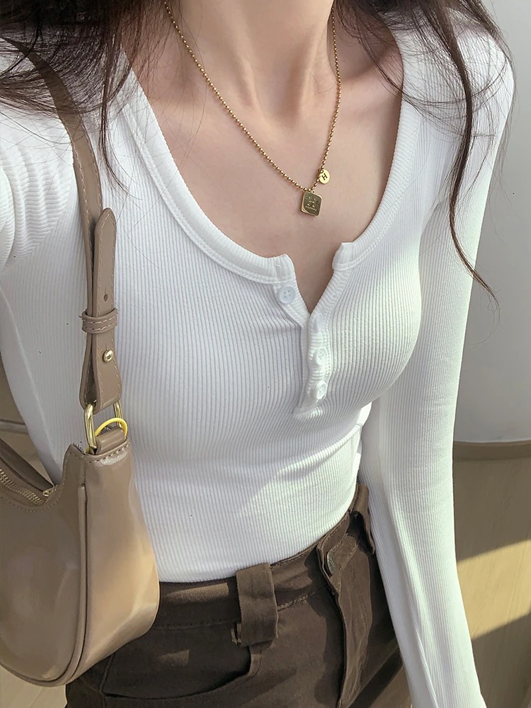 糸ボタンのプレミアム感ローネックスリムTシャツ春秋新作シックなシックな長袖女性インサイドボトムトップス Tシャツ カットソー