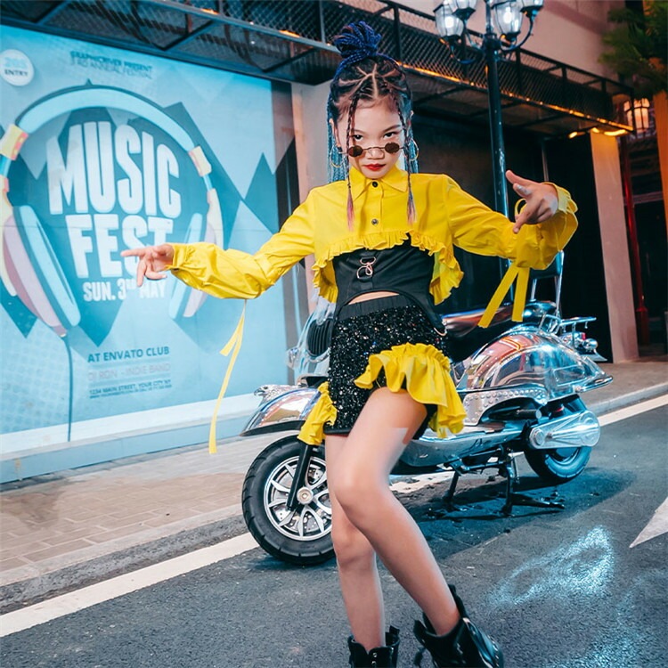 パープル ピンク イエロー セットアップ ガールズ ジャズ ダンス衣装 セットアップ スパンコール キッズ ダンス衣装 女の子 ヒップホップ チアガール 韓国 l-pop 3点セット ガールズ hip
