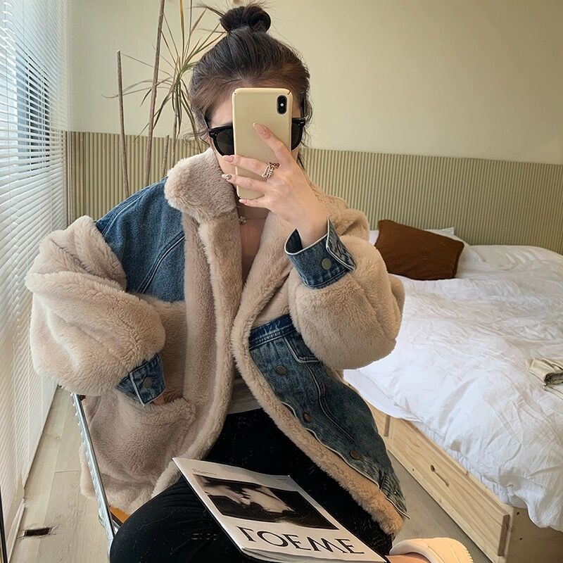 デニム切り替え 防寒 ふわふわ 厚手 毛皮 中綿ジャケット 裏起毛 皮毛一体 ラムズウール ディアフリース ダウンジャケット スウェット パーカー マウンテンパーカー プラッシュ イーザッカ