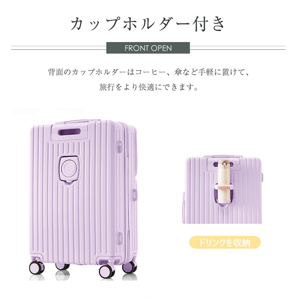 スーツケース Mサイズ フロントオープン USBポート付き ストッパー付き ドリンクホルダー付き フック付き 前開き キャリーケース キャリーバッグ おしゃれ かわいい 軽量 大容量 7日用 中型 TSAロック 前ポケット付 ビジネス パソコン suitcase China Purple