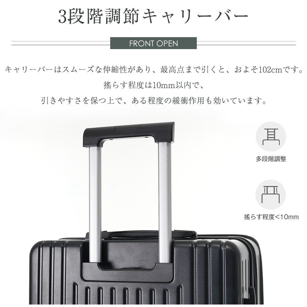 POINT 9.【3段階調節キャリーバー】キャリーバーはスムーズな伸縮性があり、最高点まで引くと、およそ101cmです。摇らす程度は10mm以内で、引きやすさを保つ上で、ある程度の緩衝作用も効いています。