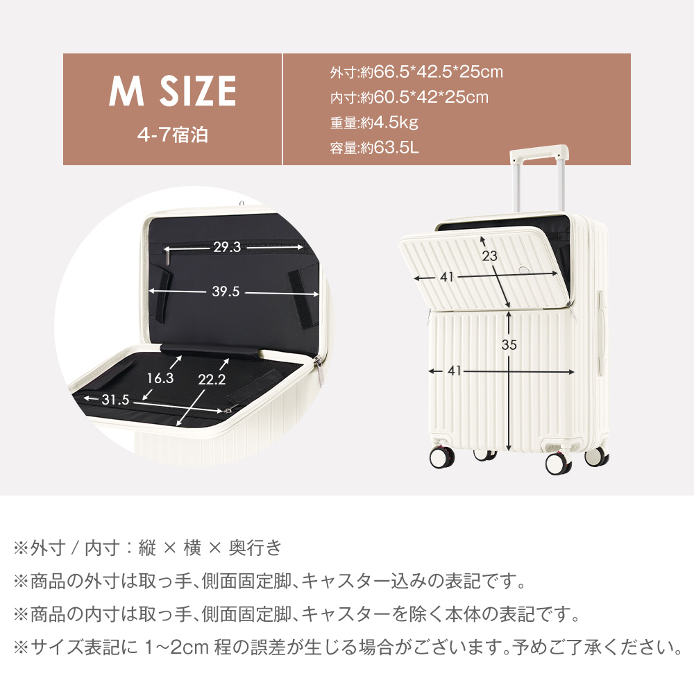 【M 4~7日宿泊】外寸:約66.5*42.5*25cm 内寸:約60.5*42*25cm 重量:約4.5kg 容量:約63.5L 【ご注意】①掲数している写真は、ご使用のコンピューター及びスマホのモニターの種類によって、実際の商品のイメージと多少異なることがございます。予めこ了承ください。②ロットによって、製品の色は多少異なりますので、こ了承とこ理解の程よるしくお願いたします。