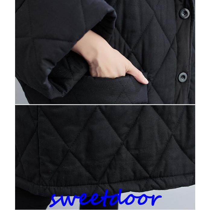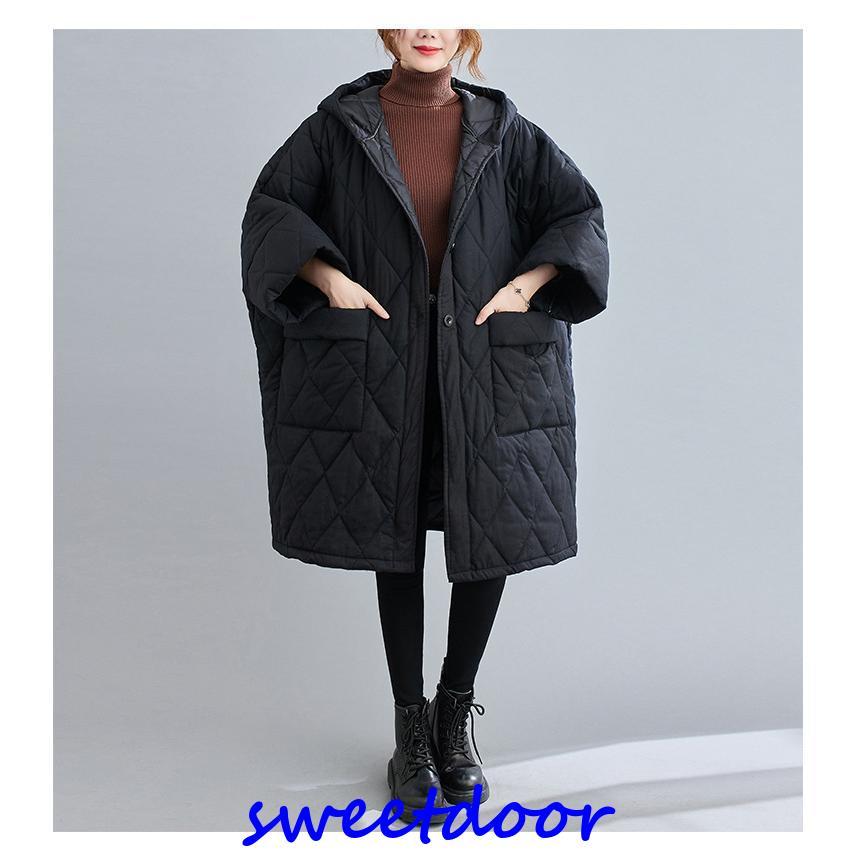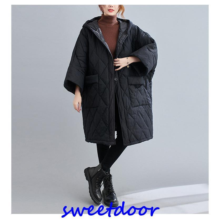 中綿コート コート レディース 冬 アウター ミディアム ロングコート 中綿 ゆったり 暖かい 体型カバー 大きい 体型カバー 防寒 フード付き 黒 40代
