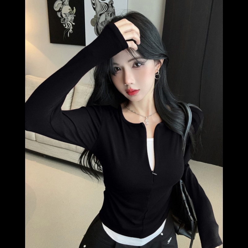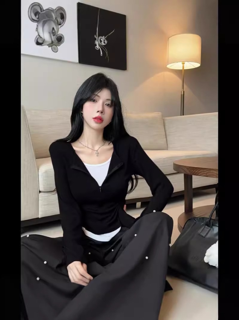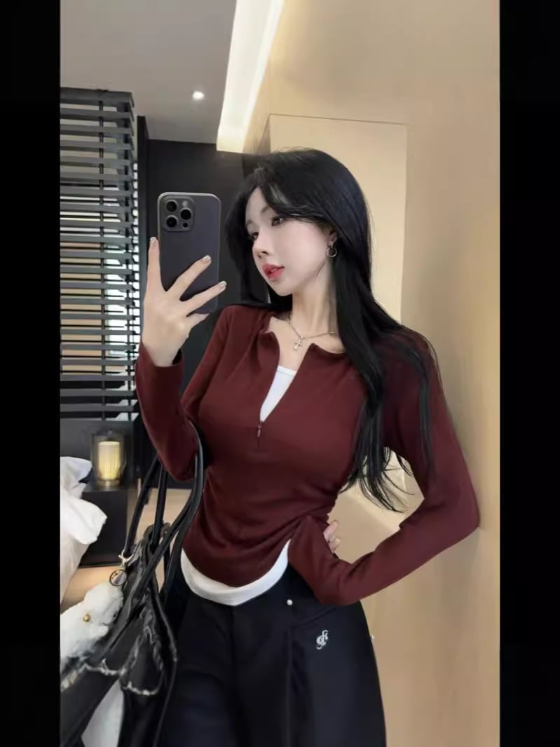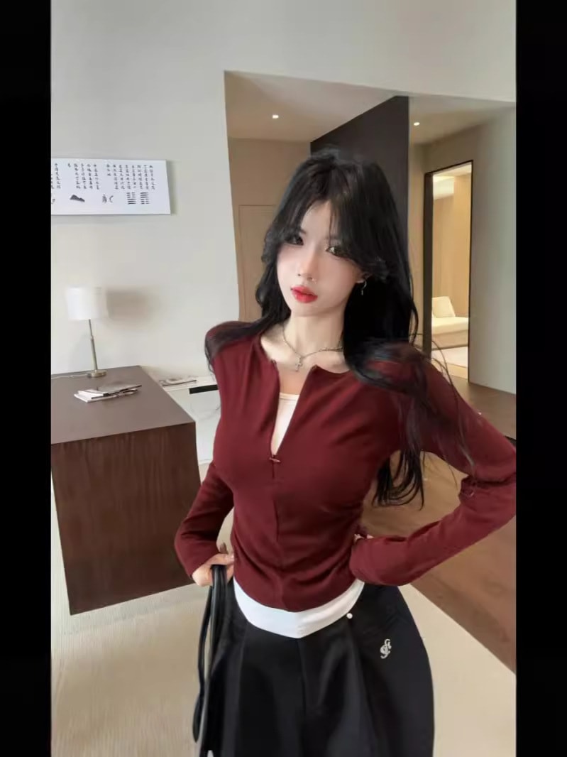 アンコールラレッド初秋の上着女性2024新型痩せ見えv襟Tシャツ気質修身正肩偽2枚の下着 Tシャツ カットソー