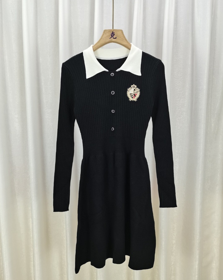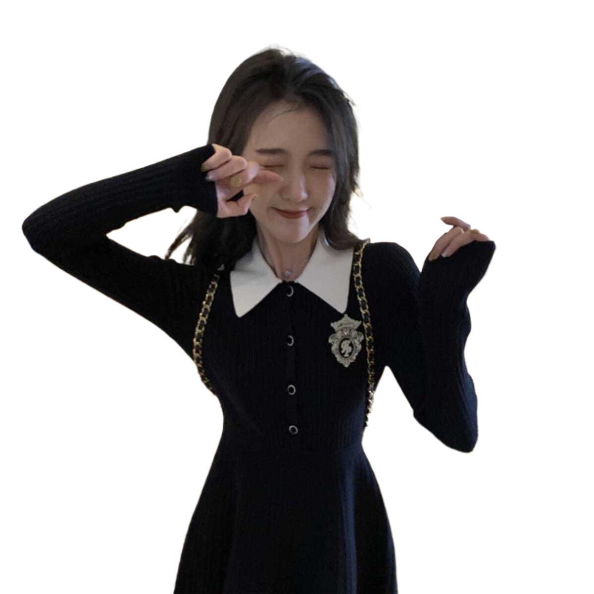 新作黒長袖ニットワンピース秋の小柄カレッジ風スレンダー着やせ気質スカート女装 長袖ロング マキシ丈ワンピ