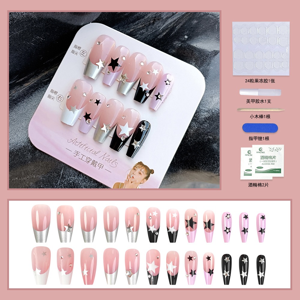 ライトセラピーハンドメイドネイルチップ ショート 24スターガラスラインストーン ジェルネイル 黒と白のフレンチスパイスネイルアート ネイルチップ