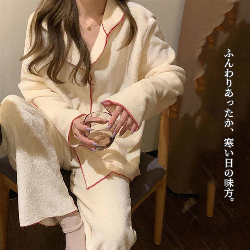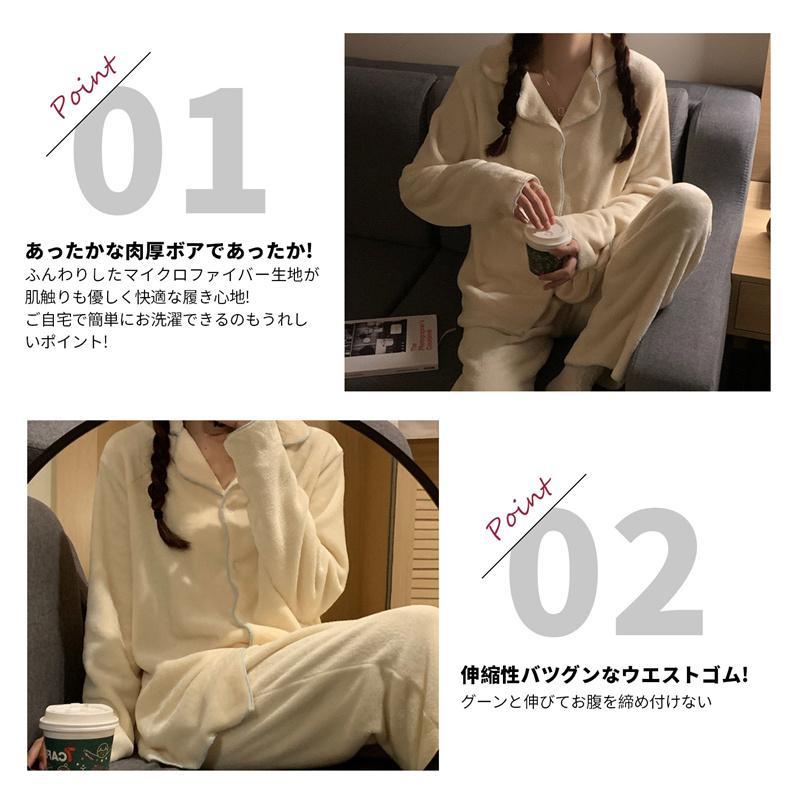 ルームウェア 上下セット もこもこ レディース パジャマ ボタン付き 無地 マイクロファイバー 厚手 ゆったり 可愛い 冬 部屋着 長ズボン
