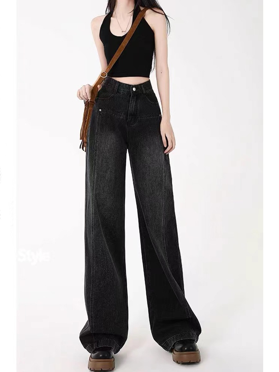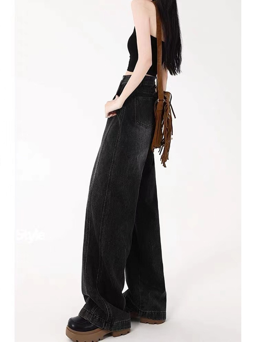 人气 新作 デニムパンツ ブラック ジーンズ レディース 春秋 ゆったり 薄手 ストレート ワイドパンツ モップパンツ デニム ジーンズ