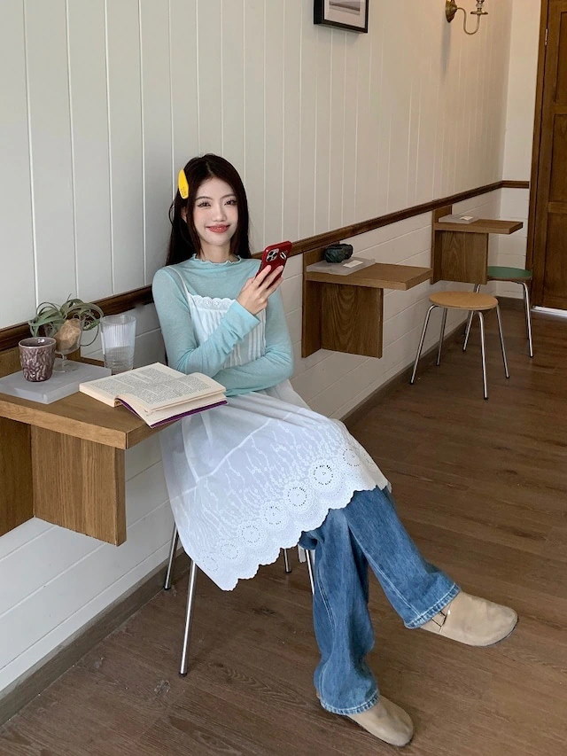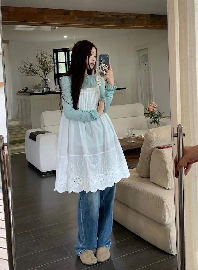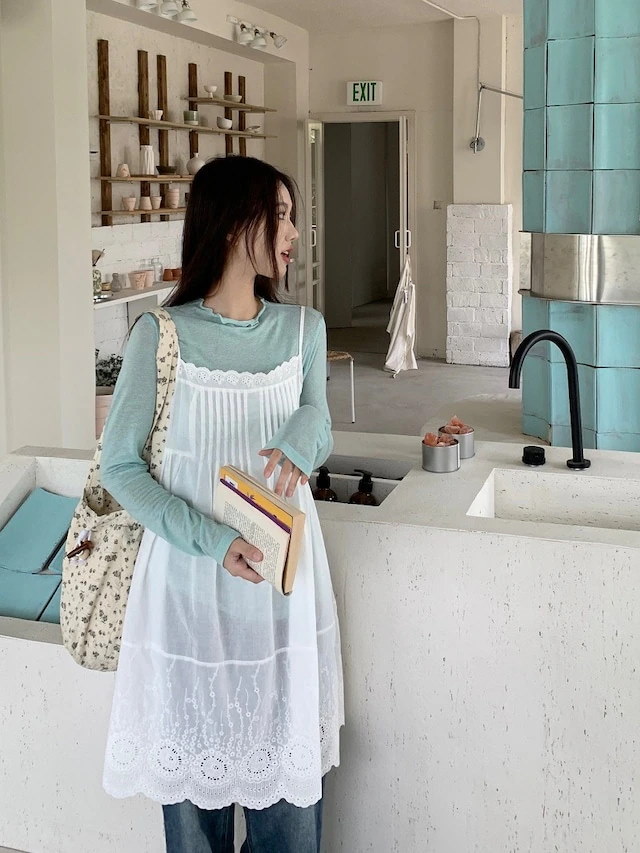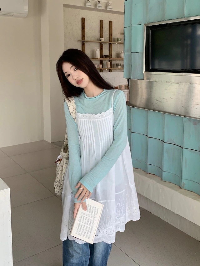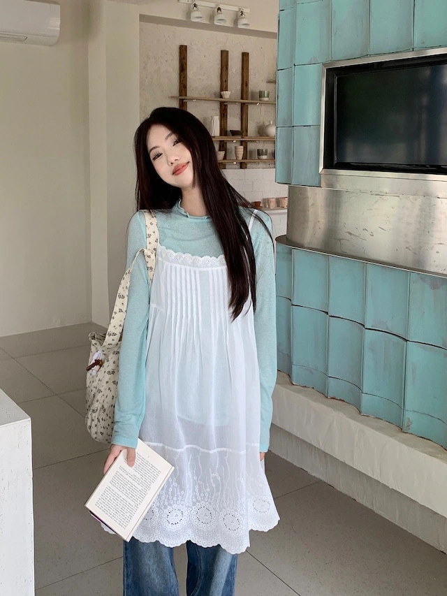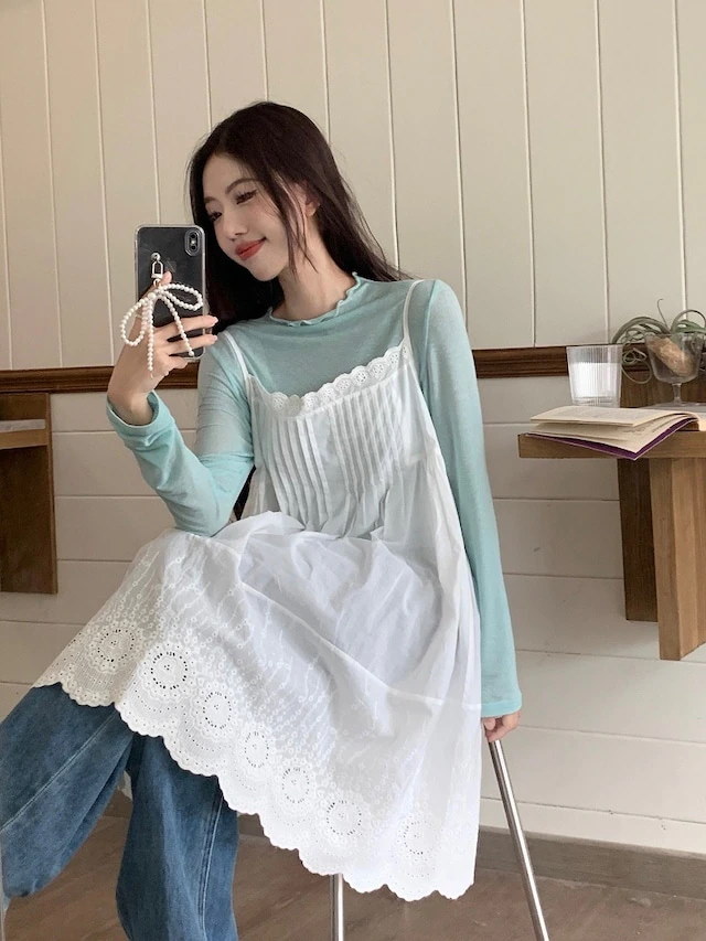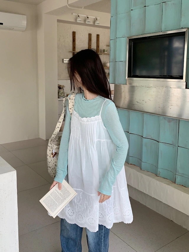 ヘビロテ キャミワンピース 膝丈 ジャンパースカート ジャンスカ ノースリーブ キャミソール Aライン レース 透かし彫り 白 ホワイト 春 韓国ファッション レディース おしゃれ かわいい ガーリ
