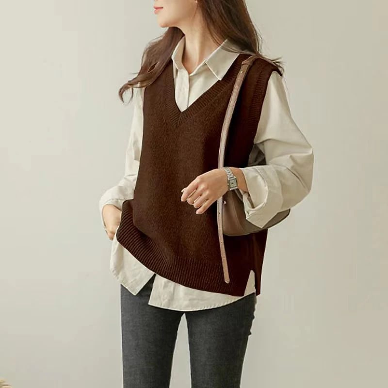 人気なリブニット 韓国ファッション レディースベスト vネック ニット通勤 トップス ノースリーブニットカーディガン 重ね着風 無地 カジュアル