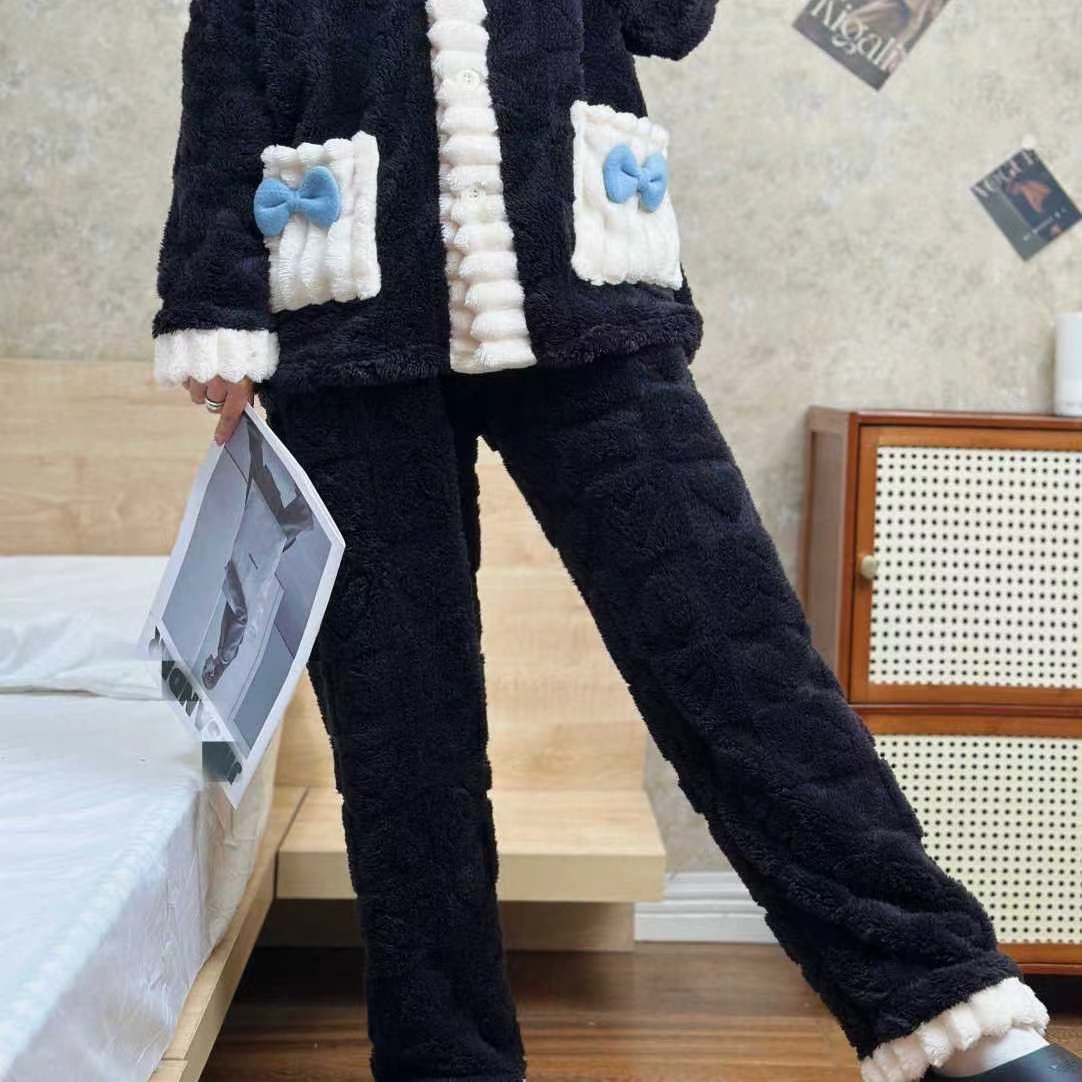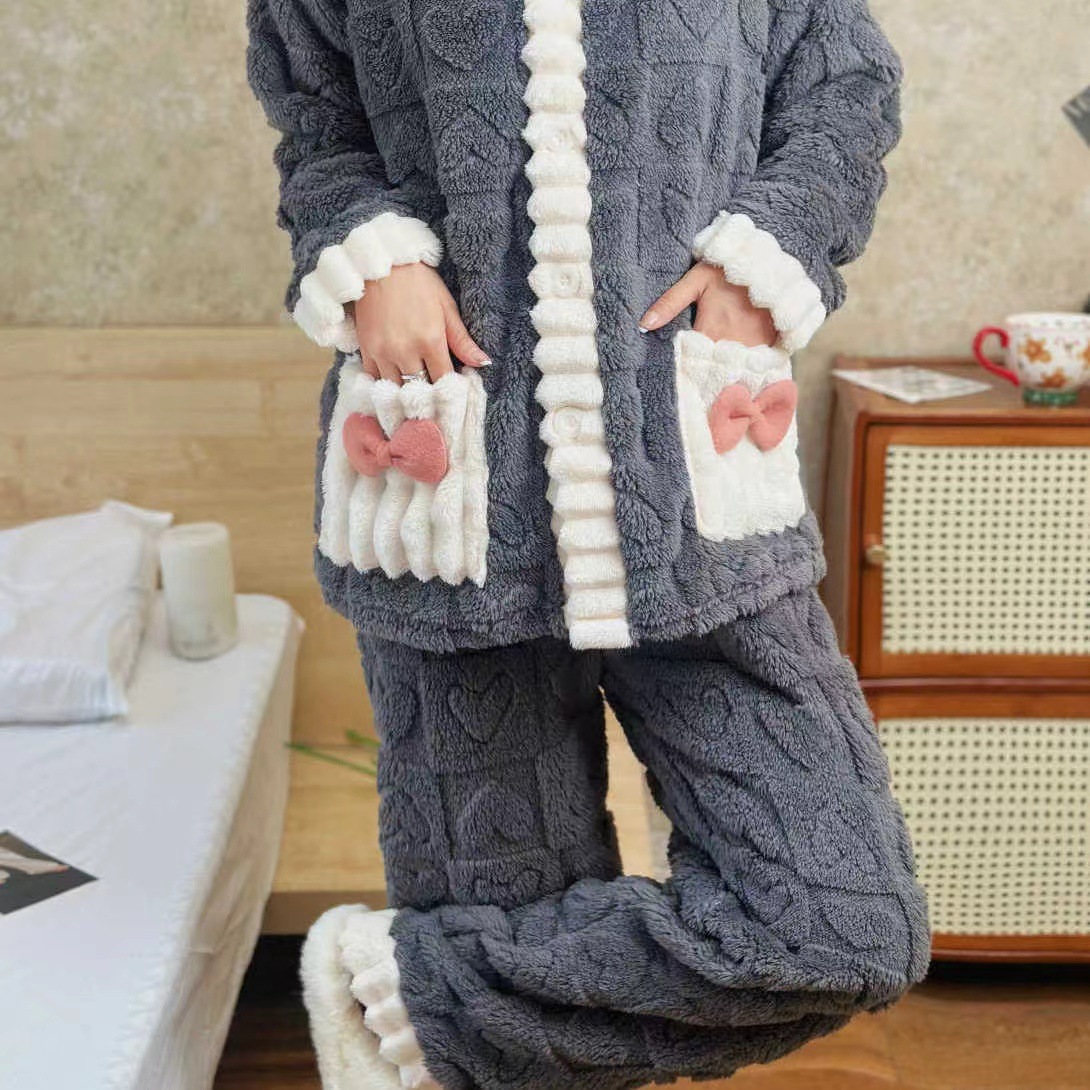 ティーン向けのキュートなポリエステルジャカードパジャマセット - Vネックニット生地リボンディテール暖かなコーラルフリースのバニー柄ラウンジウェアセット