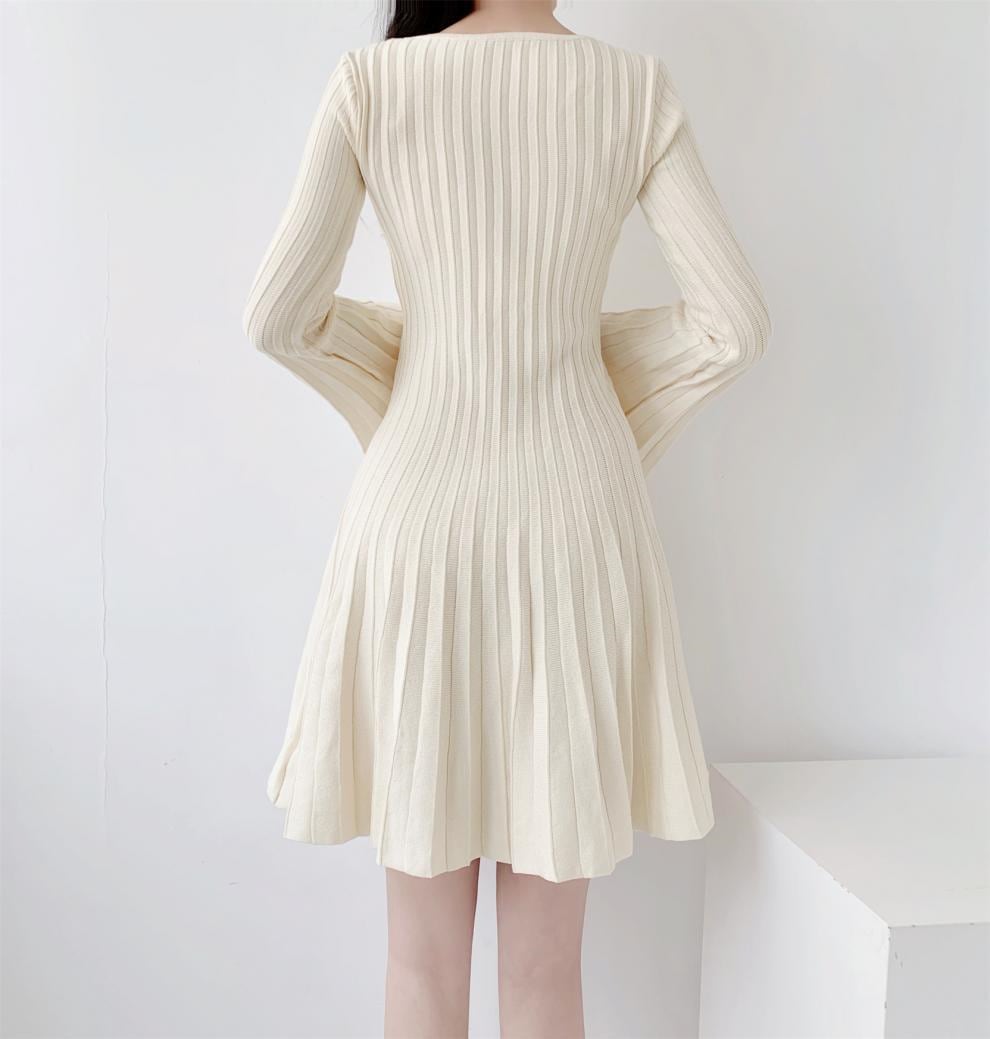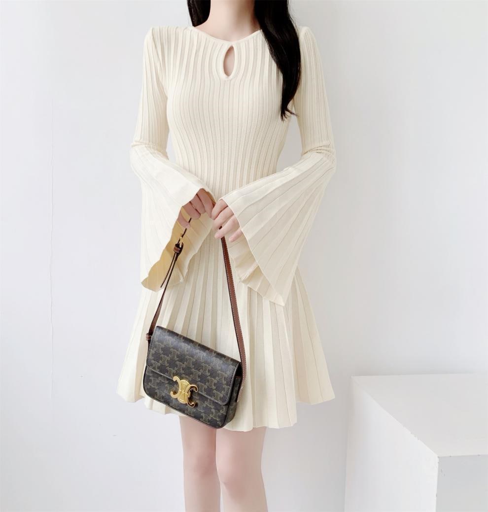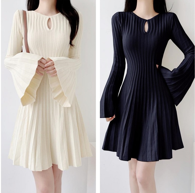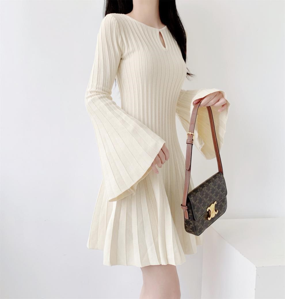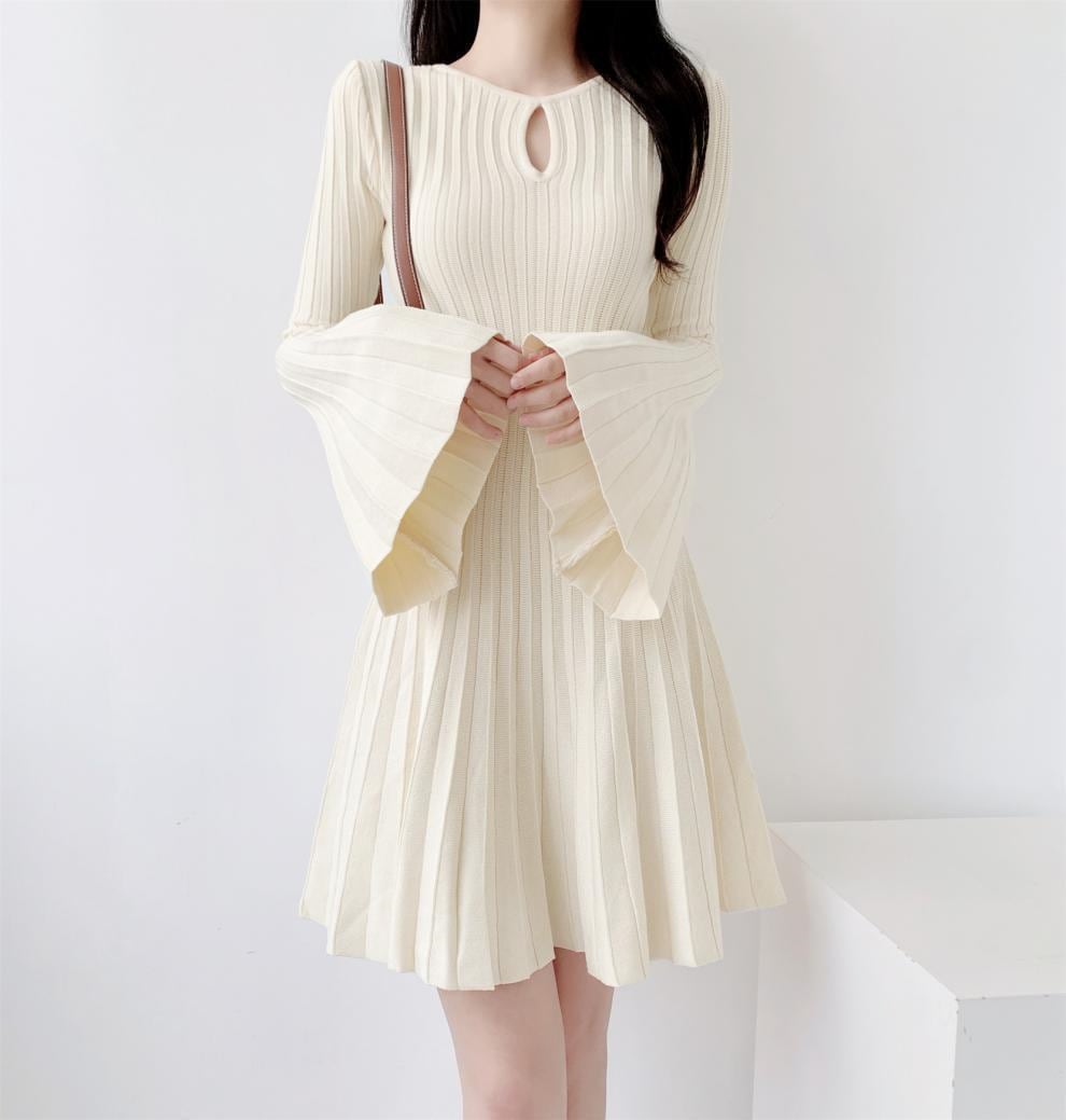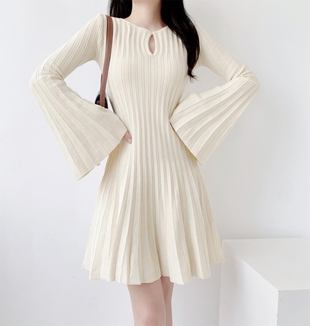 レデイース服ワンピース長袖ミニ膝丈ワンピース2024秋新品可愛いフレアスリーブラウンドネックプリーツ2色S-L 長袖ミニ 膝丈ワンピ