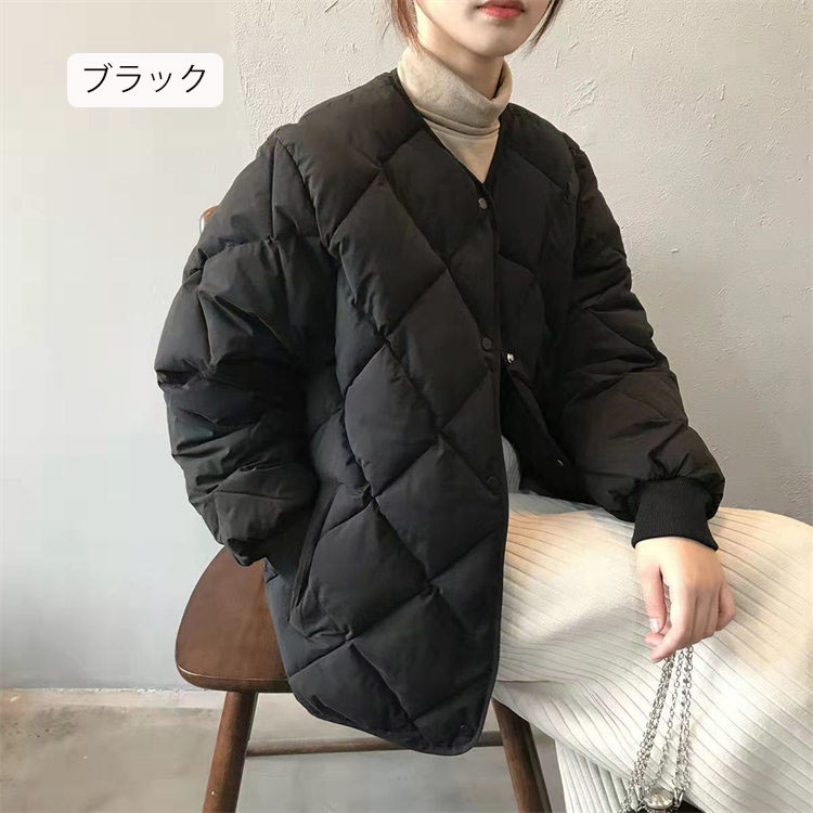 キルティングジャケット中綿ダウンレディース秋冬キルティングコート長袖ポケットノーカラージャケット中綿前開き中綿コートショート丈アウター羽織り冬物軽量中