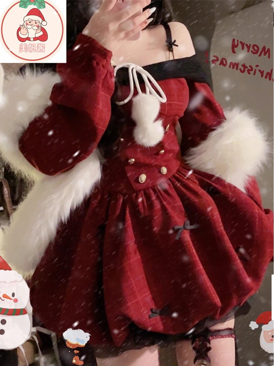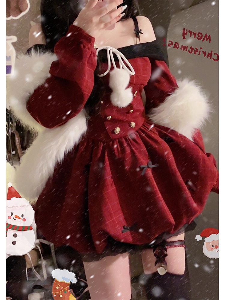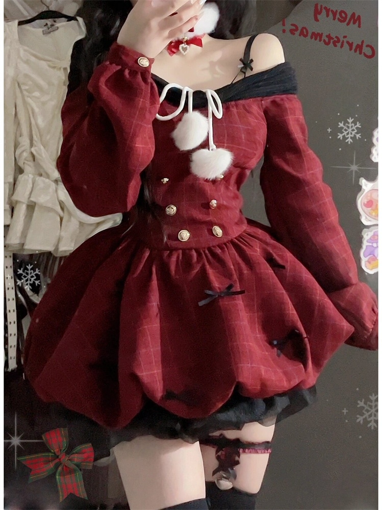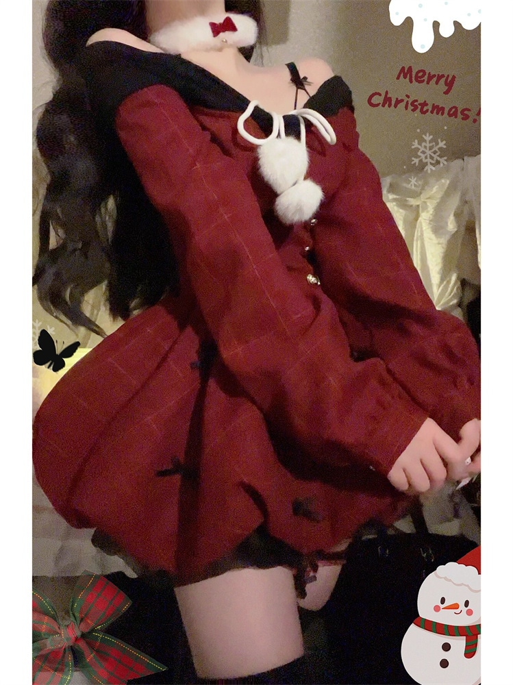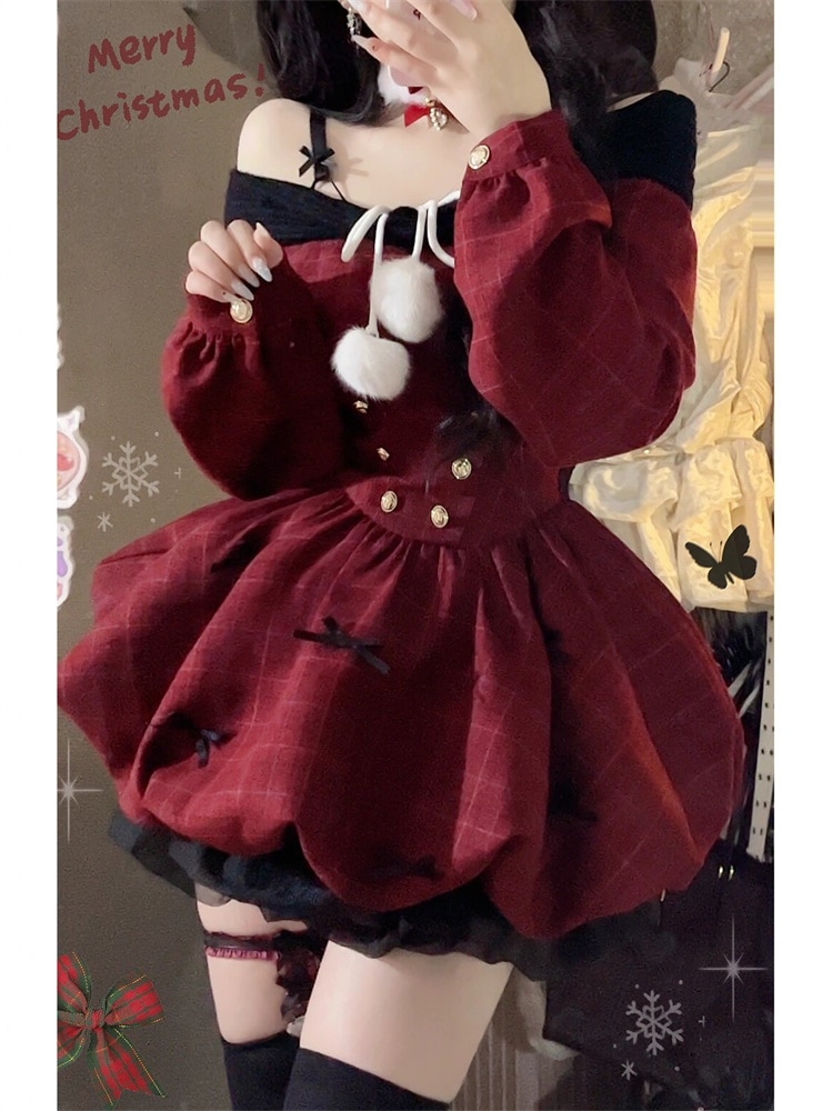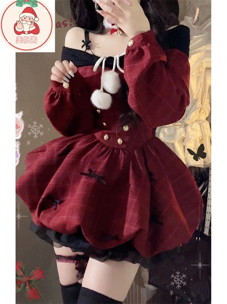 サンタコス レッド ワンラインネックライン ロングスリーブ パフ ドレス レディース コスチューム