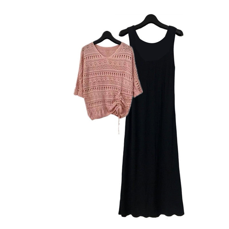 2点セット ワンピース セットアップ レディース コーデセット 黒ワンピース カットアウト ニット カジュアル オシャレ ゆったりめ 気質 女子会
