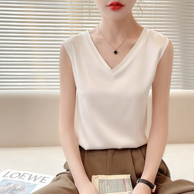 無料 2枚300 OFF Vネック サテンシルク 冷感 タンクトップ カーディガン ブラウス 2024春夏レディーススリムVネック上着キャミタンクトップ高級感カップ 付きインナー