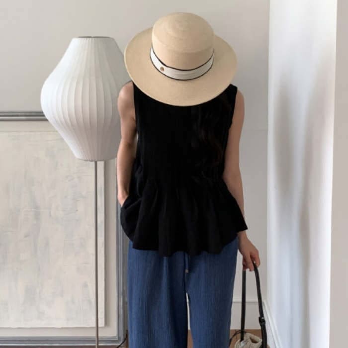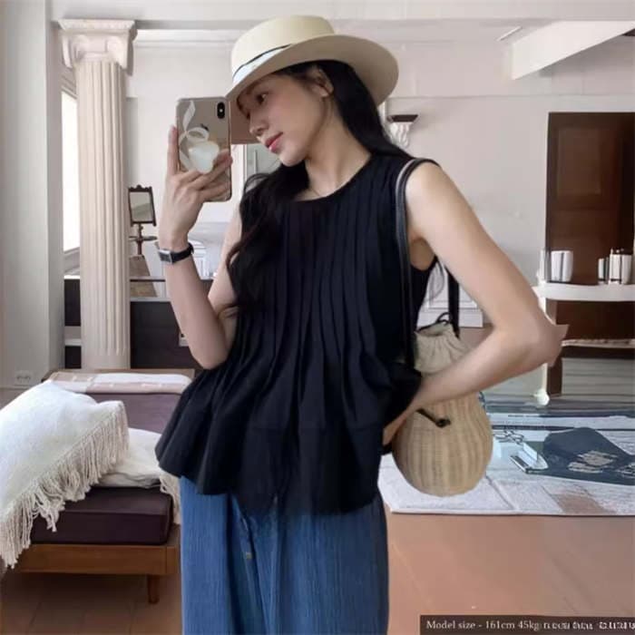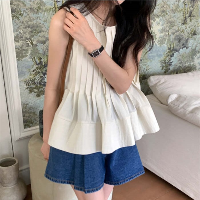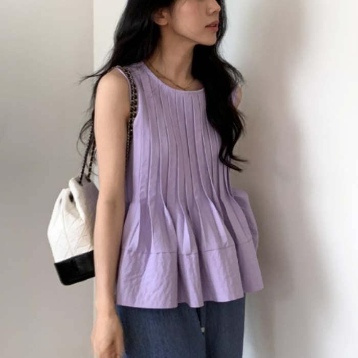 ブラウス トップス シャツ レディース ノースリーブ 春 夏 無地 タンク クルーネック 丸首 大きいサイズ シンプル チュニック プリーツ フリル フレア Aライン ゆったり 体型カバー おしゃれ