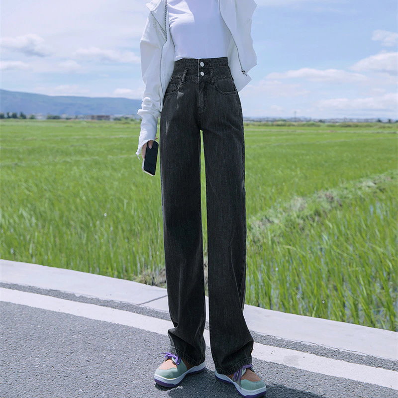 春 夏ハイウエストワイドパンツジーンズ着痩せ垂れ感ゆったりストレートジーンズひんやりボトムス