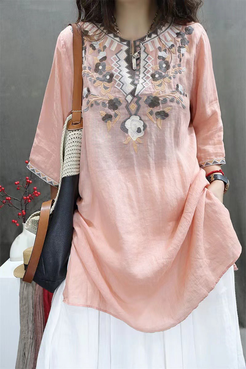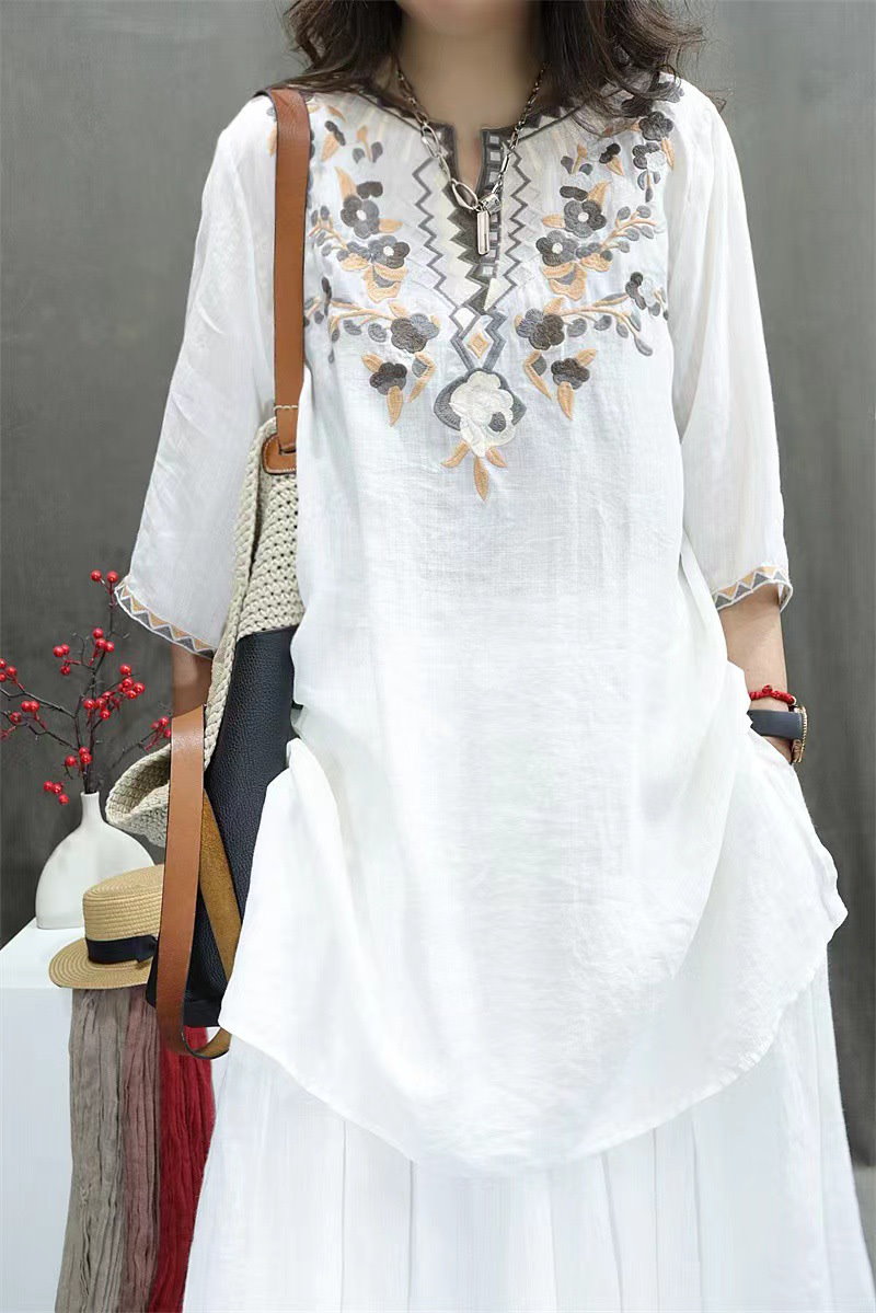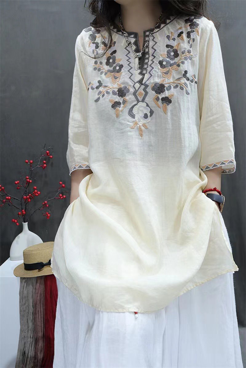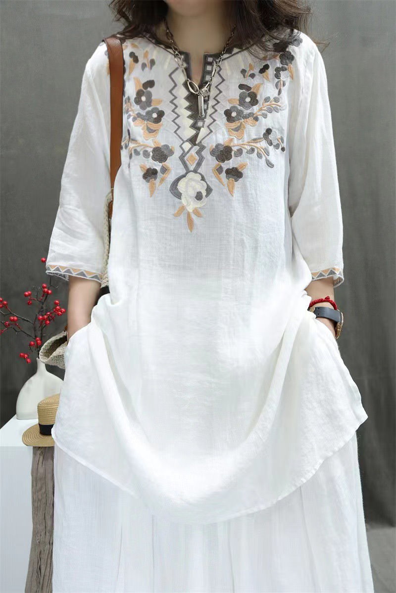 棉麻ブラウス レディース トップス 7分袖 ドルマン レース 刺繍 ドルマントップス 綿 コットン オーバーサイズ 透かし彫り 体型カバー ゆったり