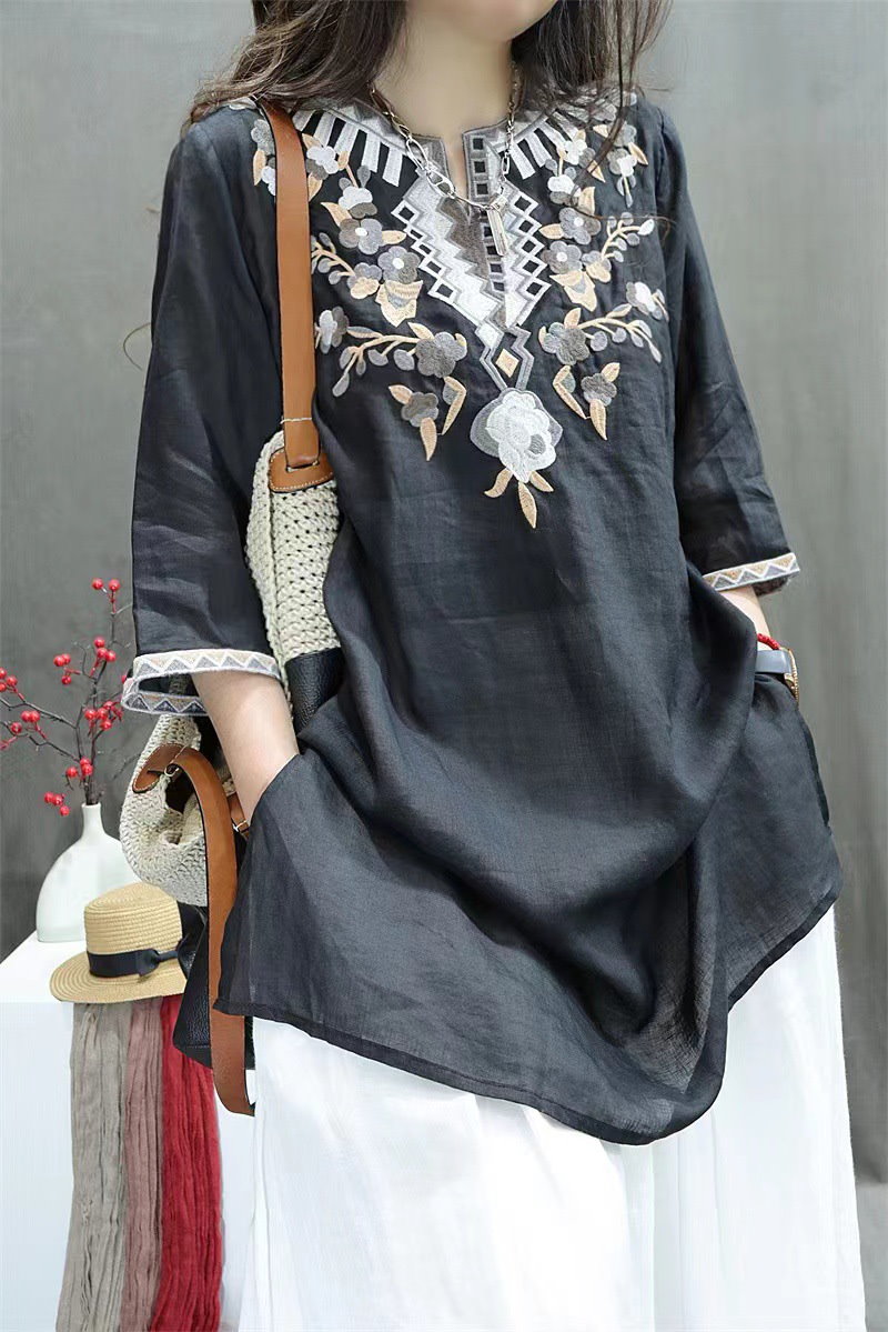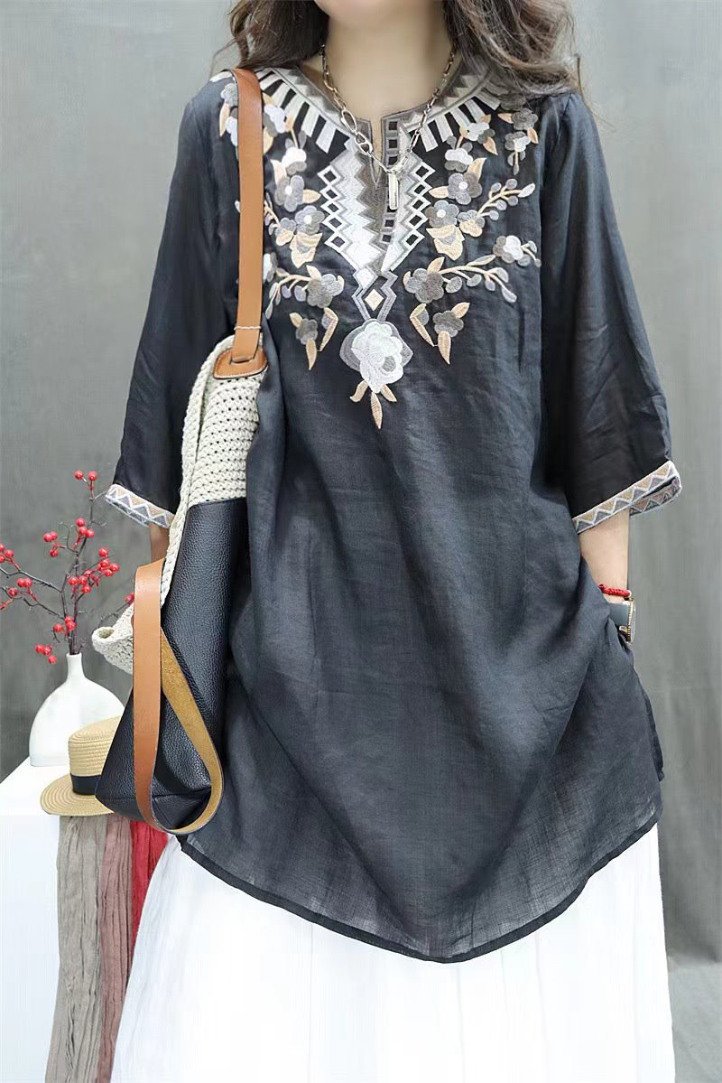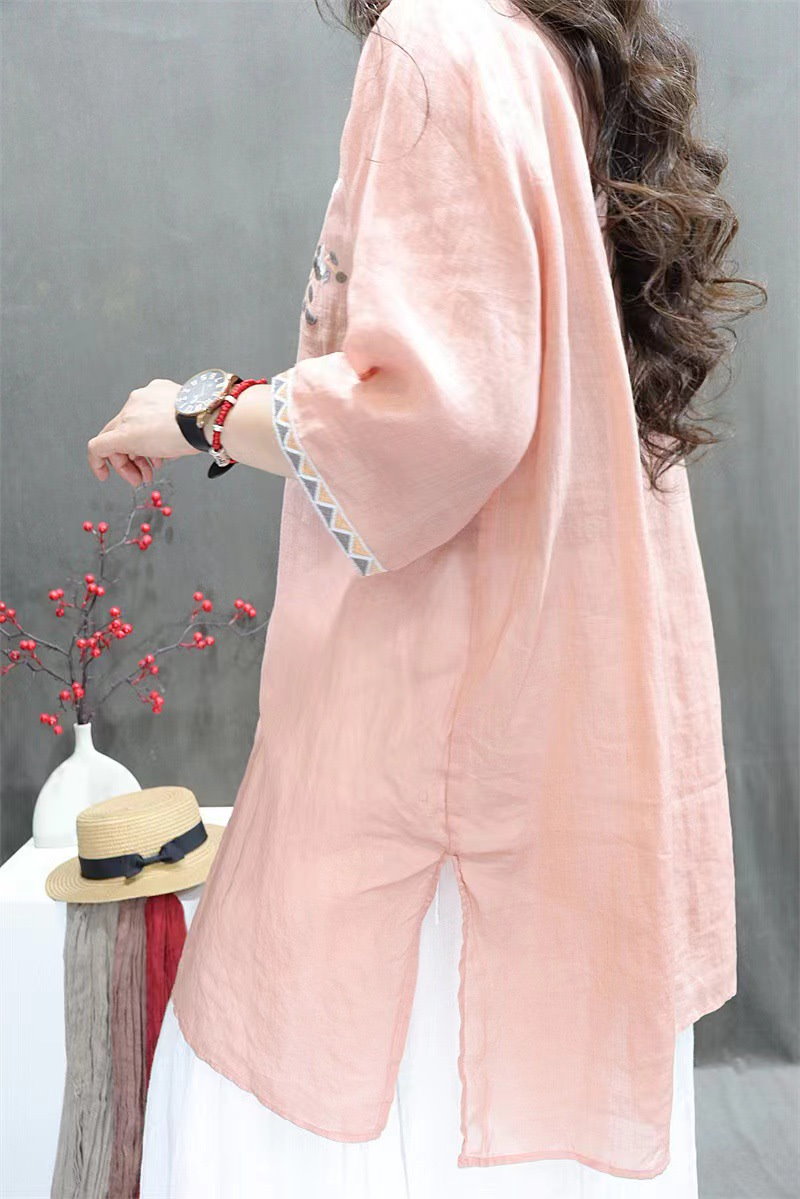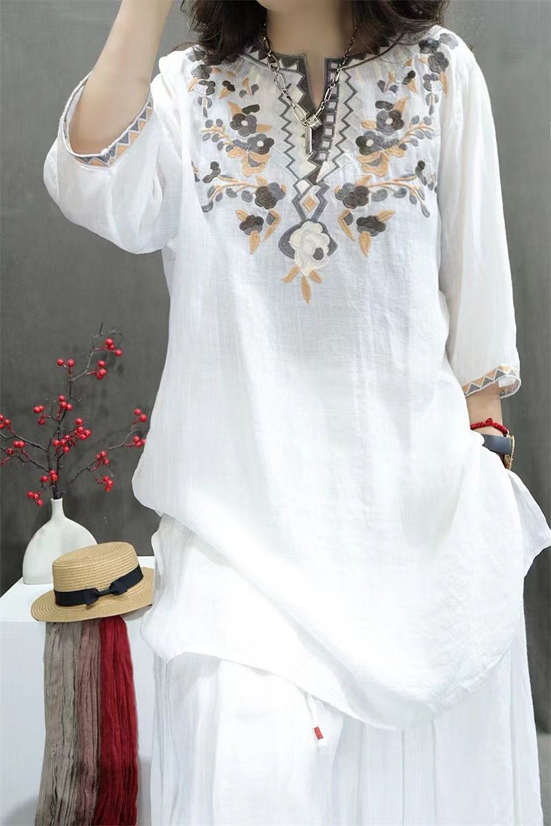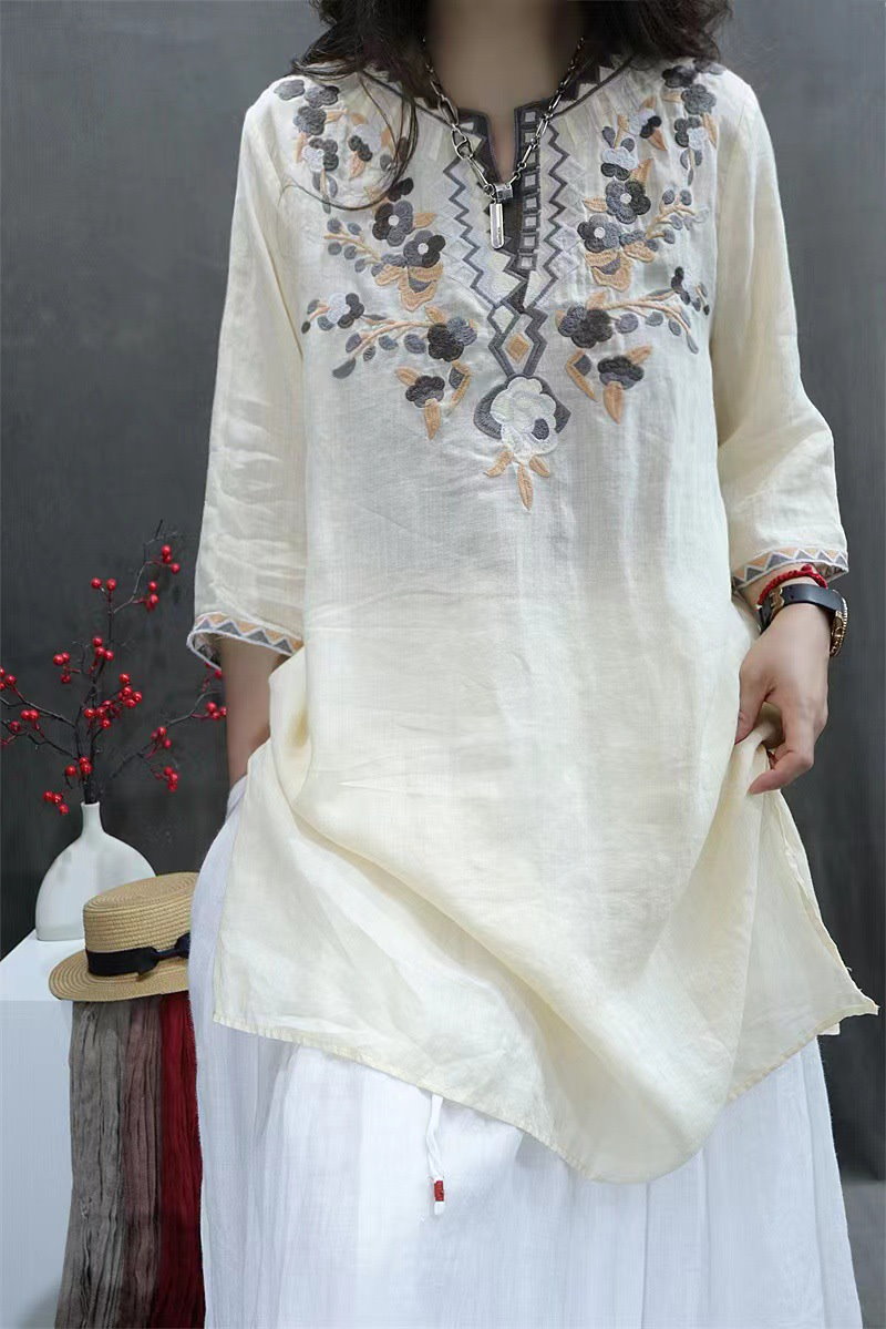 棉麻ブラウス レディース トップス 7分袖 ドルマン レース 刺繍 ドルマントップス 綿 コットン オーバーサイズ 透かし彫り 体型カバー ゆったり