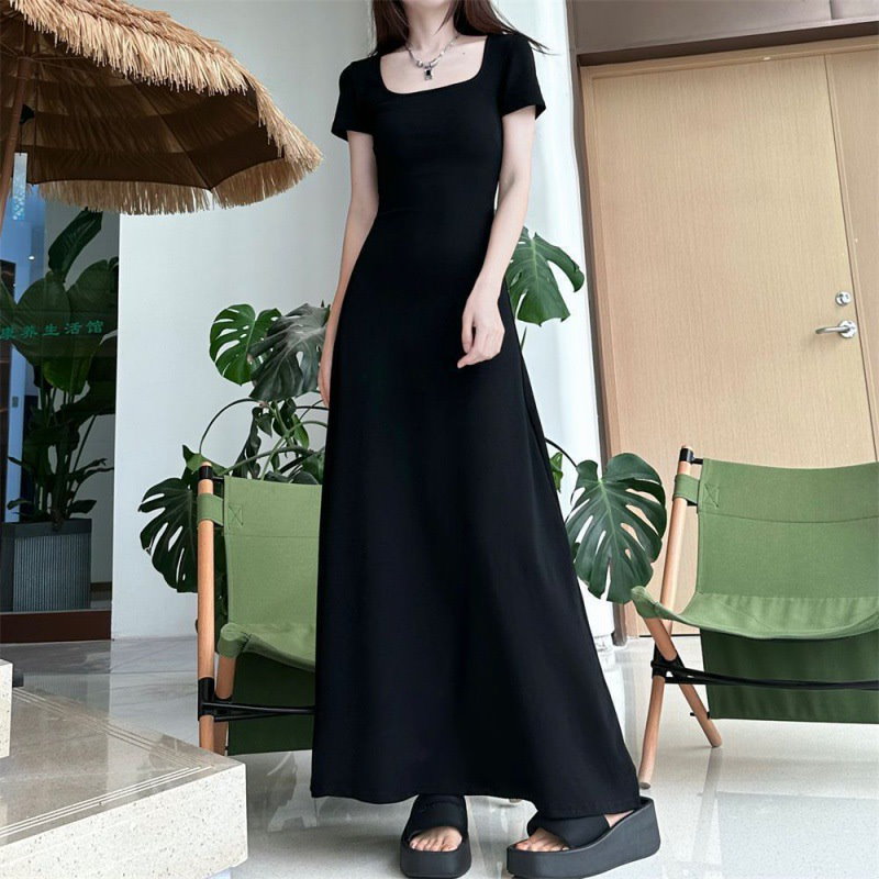 無地で痩せて見えるロングワンピース夏ワンピース痩せ見え半袖雰囲気ロングドレス2024新型フィットフレンチウエスト裾スカート