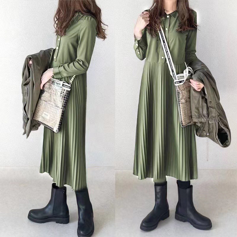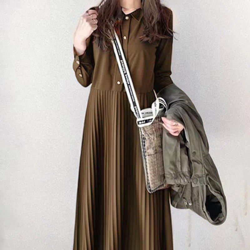 韓国ファッション 秋新作 ワンピース ロングワンピース パーティードレス ド パーティードレスプリーツワンピースシャツワンピース 気品 長袖ワンピース メガ割