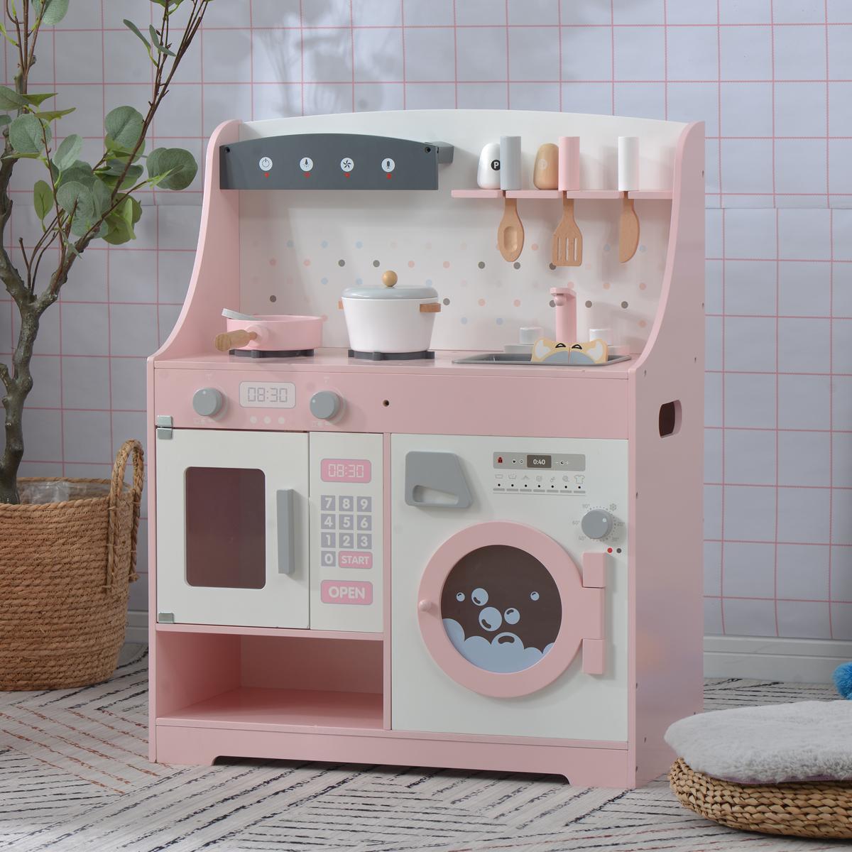 おままごと キッチン 木製 誕生日 台所 洗濯機 調理器具付き 調味料 食材 知育玩具 おもちゃキッチン キッズ ベビー Pink MDF