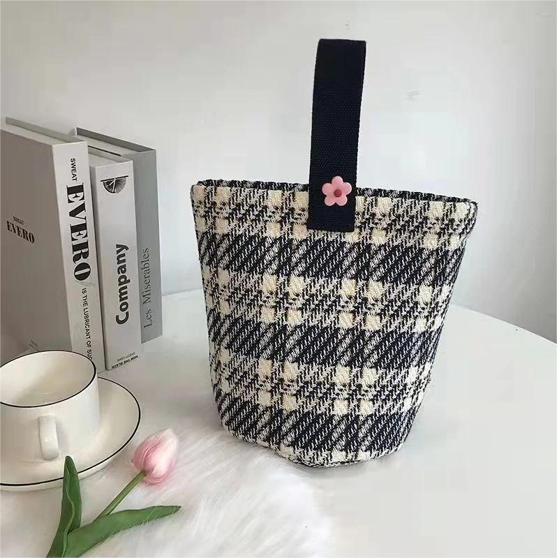 ファッションシンプルチェック柄韓国キャンバスバケットバッグカジュアル多用途ママバッグ厚みのあるランチボックスバッグハンドバッグ ハンドバッグ
