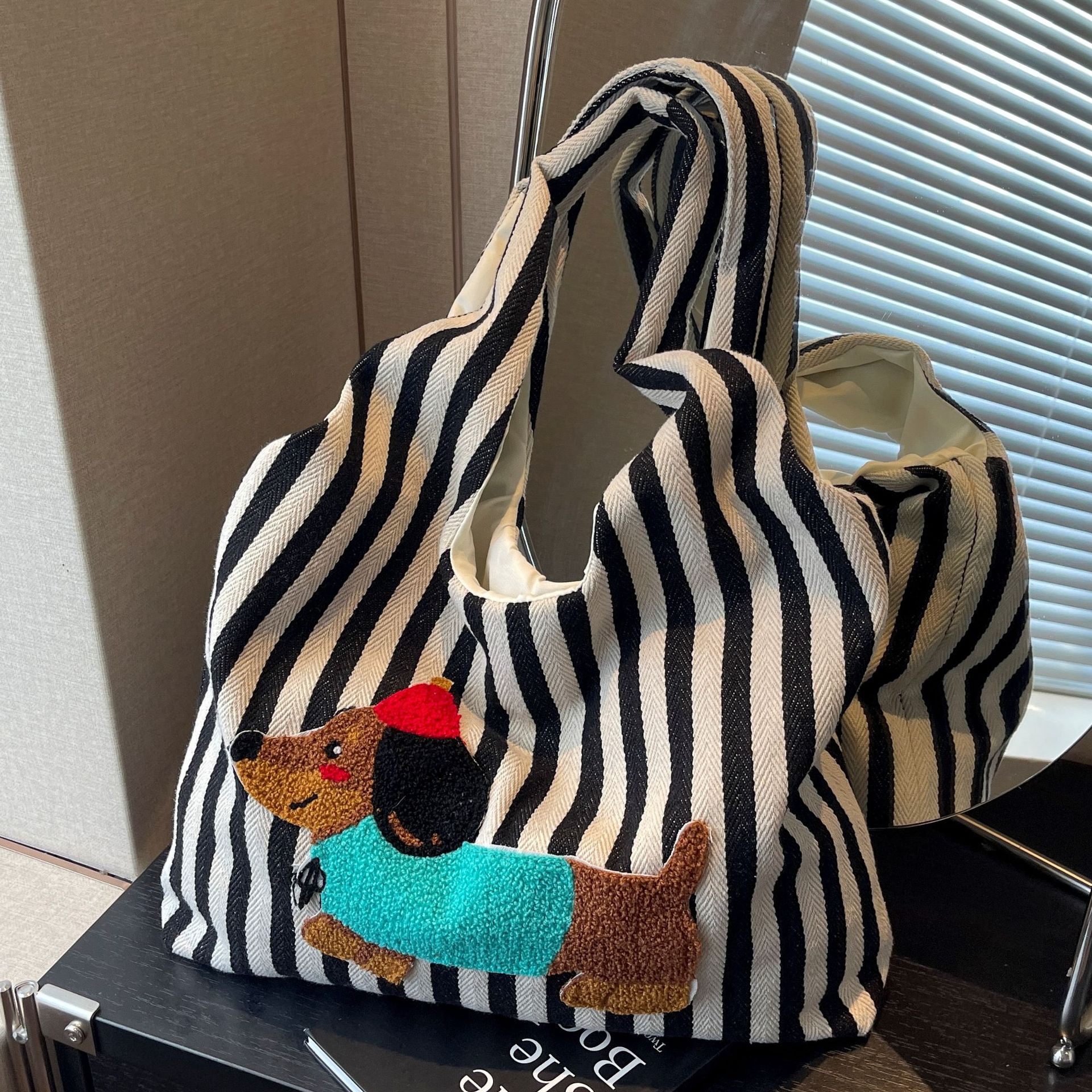 かわいい漫画刺繍子犬ショルダーバッグファッションストライプキャンバス手持ち脇バッグ大容量通勤トートバッグ ハンドバッグ