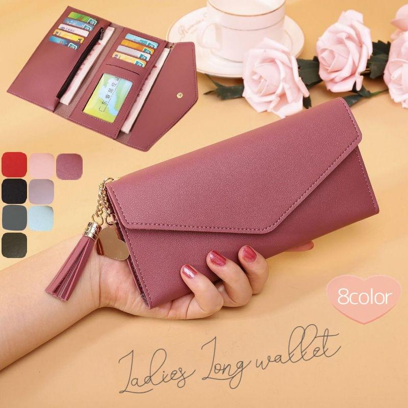 長財布 3つ折り 三つ折り レディース シンプル 無地 カード入れ 小銭入れ スナップボタン開閉 横長 レザー調 上品 タッセル ハートチャーム お札