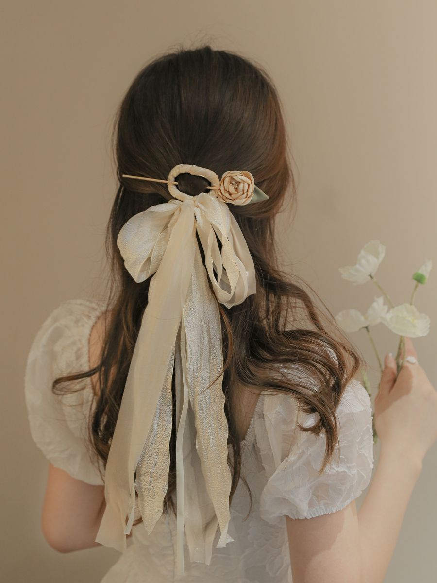 紗に花をつけた簪古風なかんざし雰囲気のリボン飾り高級感のあるリボン飾り ヘアクリップ