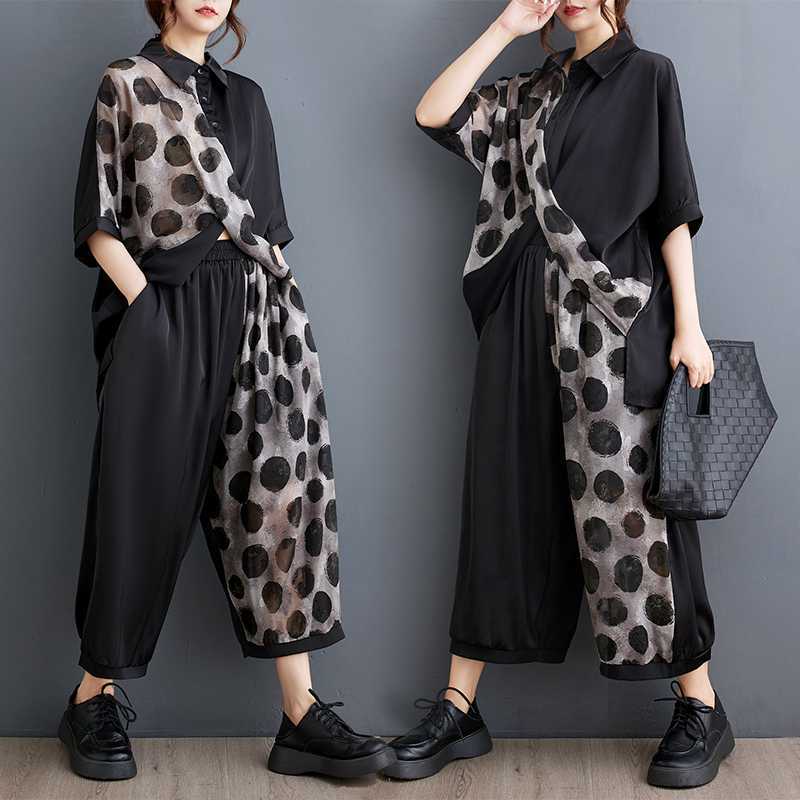2025夏新品 上下セット 水玉 七分袖シャツ+九分丈ワイドパンツ 大きいサイズ 体型カバー レディース セットアップ メガ割
