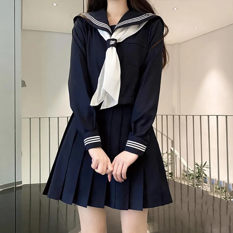 セーラー服 紺色 女子高生 3点セット ハロウィン 仮装 JK 制服 コスチューム 長袖 前開き 上下セット プリーツスカート 人気 女子制服 本格制服 紺三本 文化祭 学园歳 卒業式 清純 可愛い