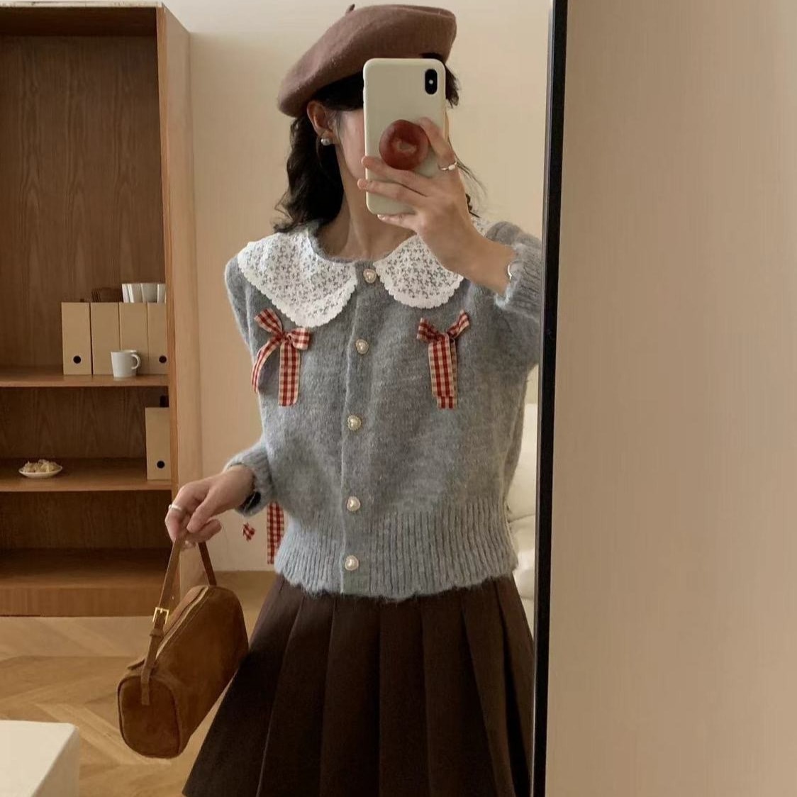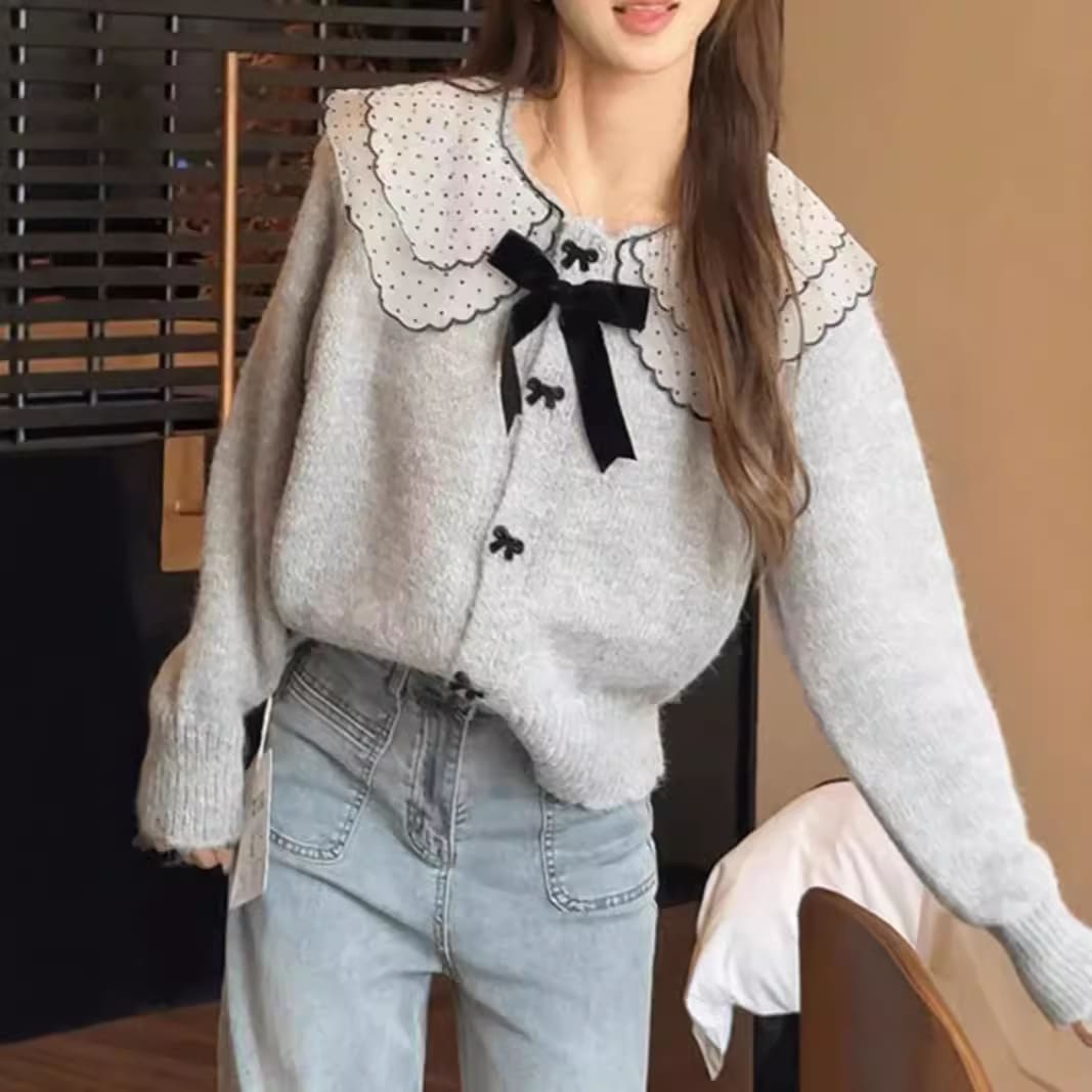 優しい甘い蝶ネクタイ人形襟セーター女性秋冬韓系柔らかいモチモチニットのカーディガンデザイン感コート上着 カーディガン