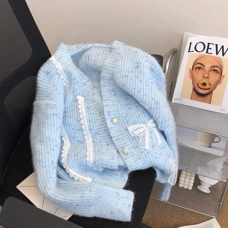 秋冬新作韓国系蝶結びレースニットカーディガン少女風減齢優しいセーター上着 カーディガン